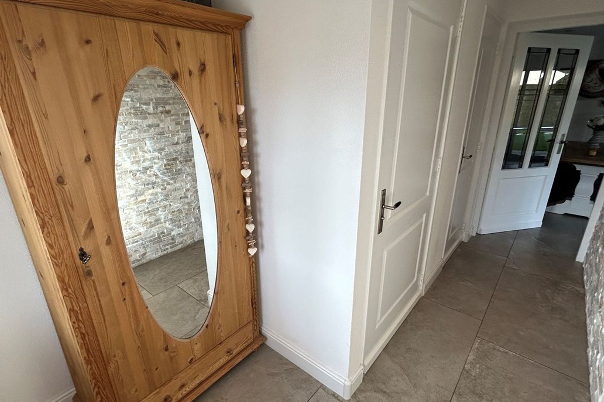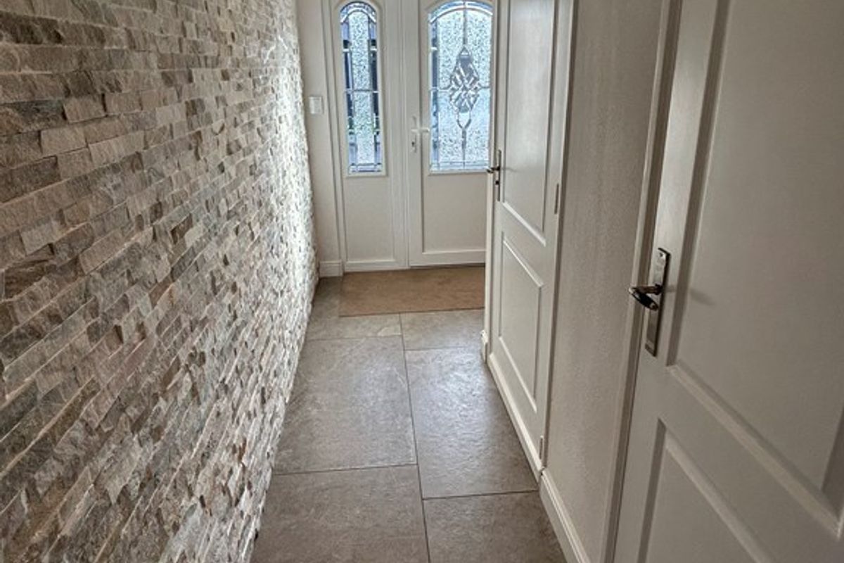 Entree/hal 3,85 x 2,15/1,05 met plavuizenvloer, inbouwspots, deur naar woonkamer, toilet en technische ruimte.