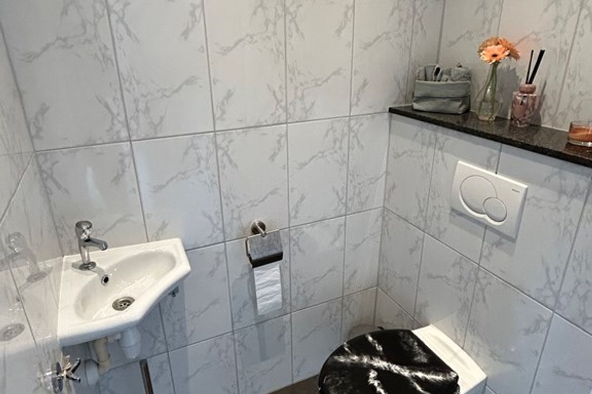 Gastentoilet 1,40 x 1,00 met plavuizenvloer, hangtoilet, inbouwspots en mechanische ventilatie.