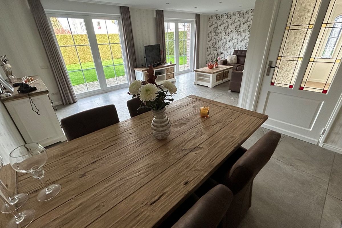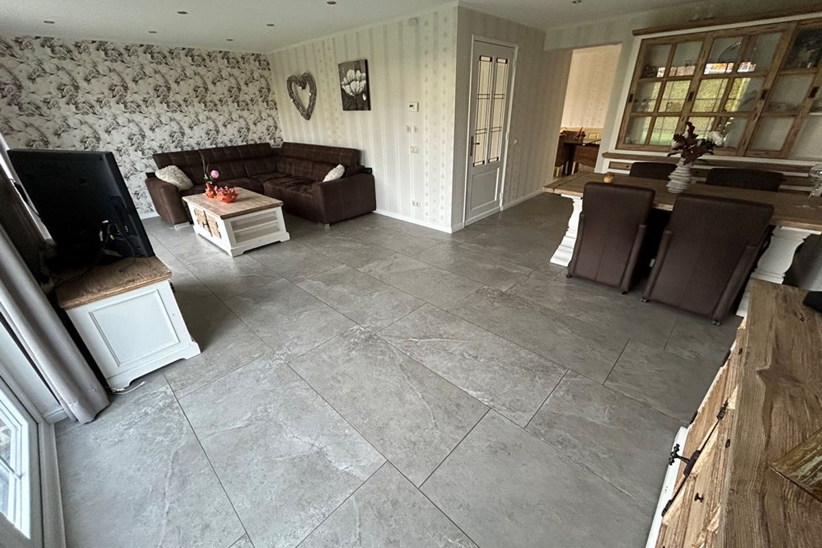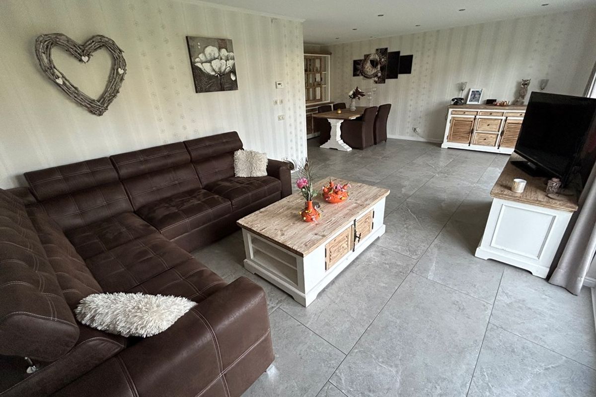 L-vormige woonkamer 7,40 x 5,85/3,80 met plavuizenvloer, inbouwspots, twee keer openslaande deuren naar tuin, doorgang naar keuken en deur naar portaal.