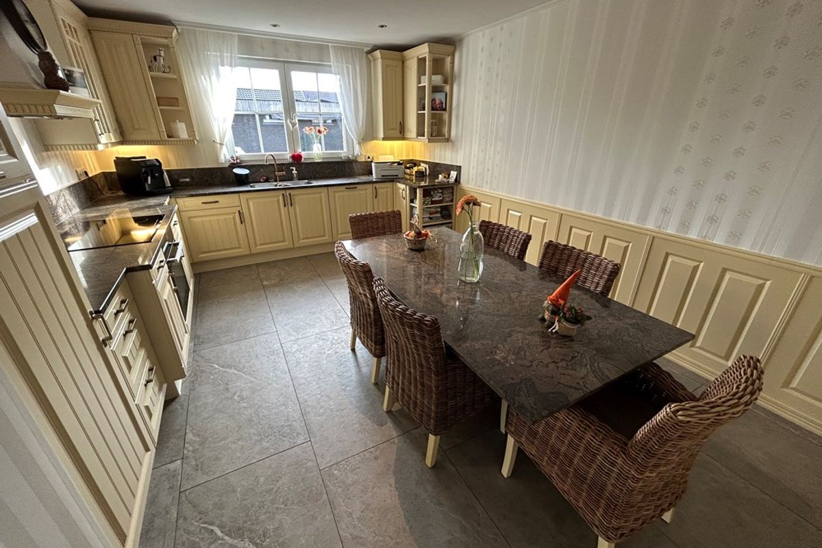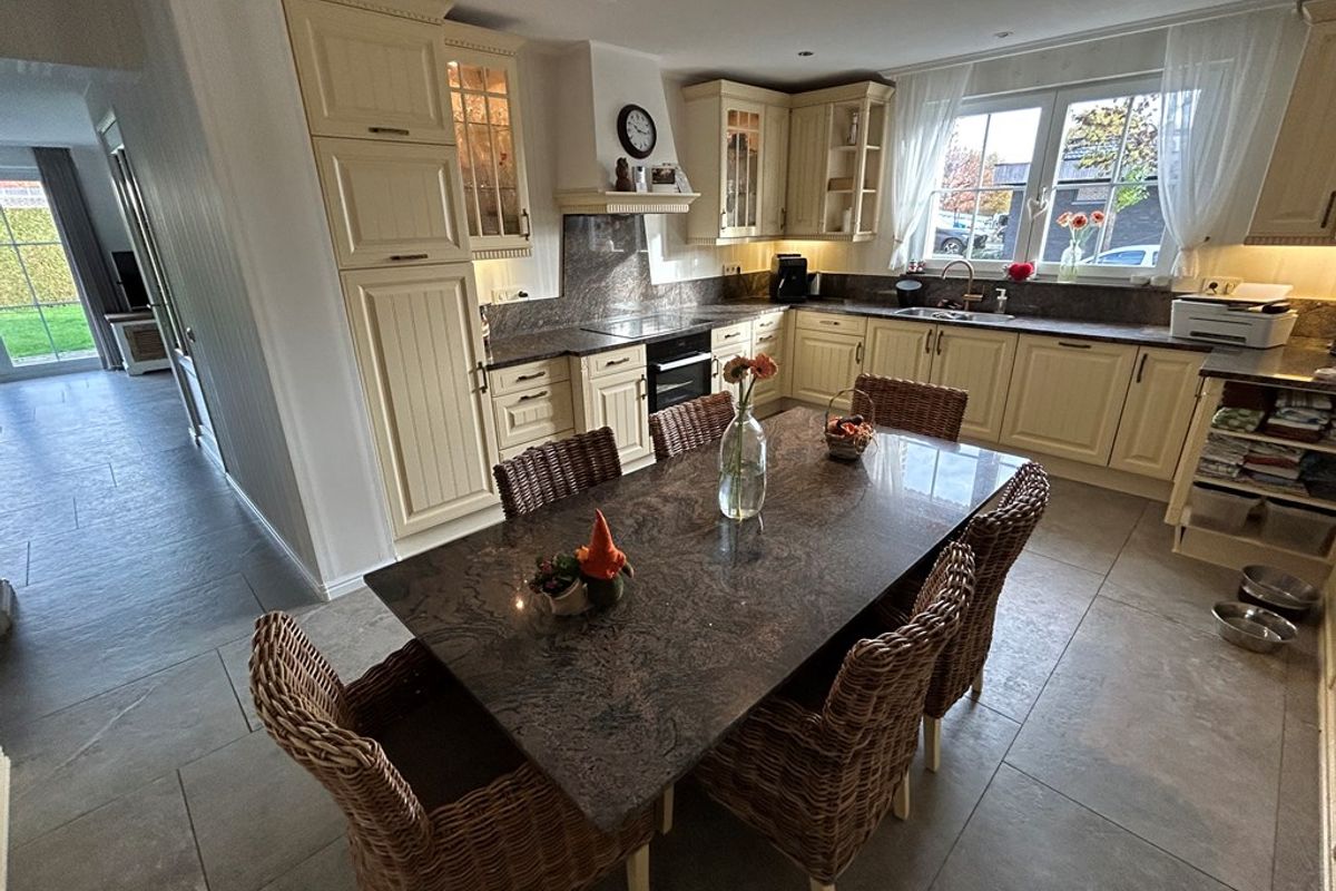 Tafel met granieten werkblad en stoelen blijft bij keuken.