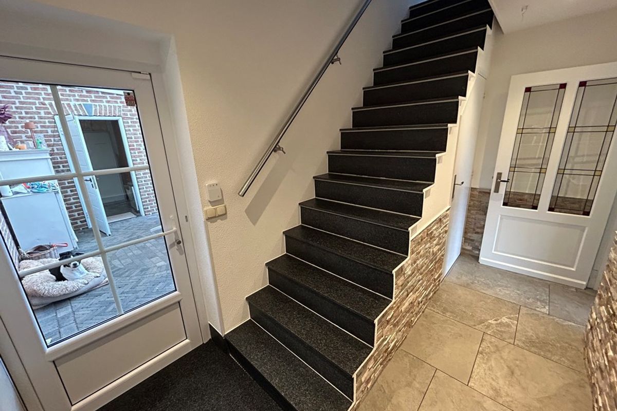 Portaal 4,00 x 1,05 met plavuizenvloer, inbouwspots, deur naar overkapping en betonnen trap met granieten treden naar verdieping.