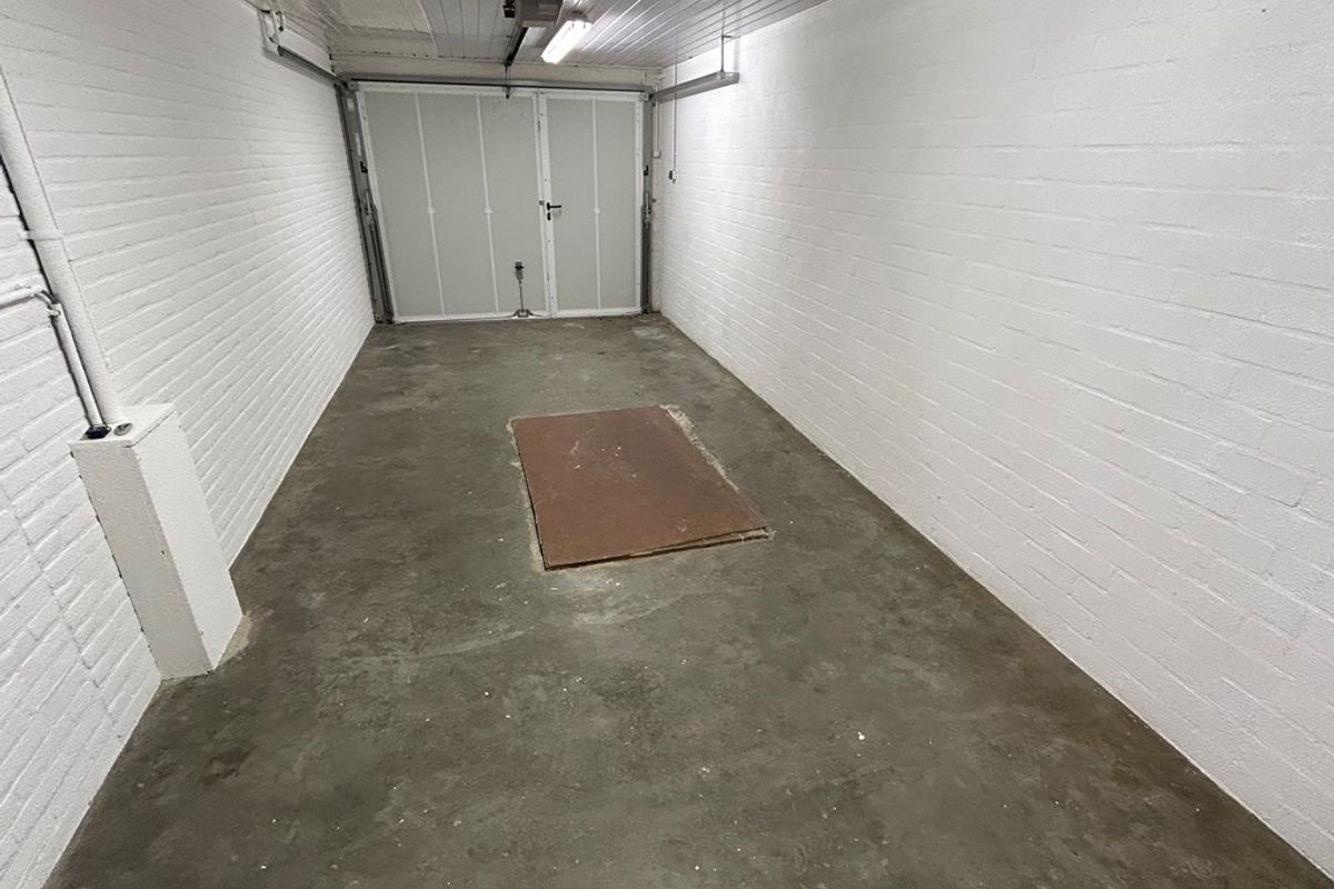 Garage 9,30 x 2,90/2,45 met elektrisch bedienbare sectionaal poort met loopdeur, smeerput, wasbak, elektriciteit en deur naar achtertuin.