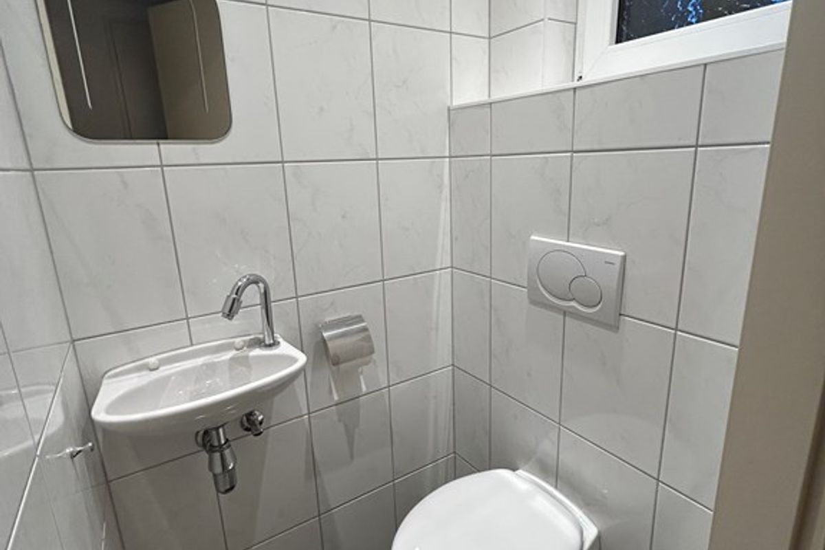 Gastentoilet 0,95 x 0,85 met plavuizenvloer, inbouwspots, hangtoilet en fonteintje.
