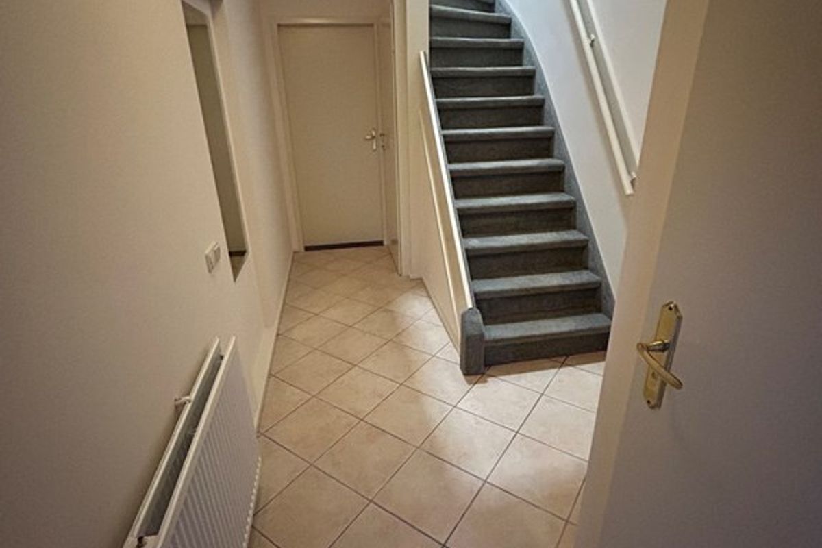 Entree/gang 5,00 x 1,15 met plavuizenvloer, nieuwe meterkast met slimme meters, deur naar keuken, toilet en berging onder trap en trap naar verdieping.