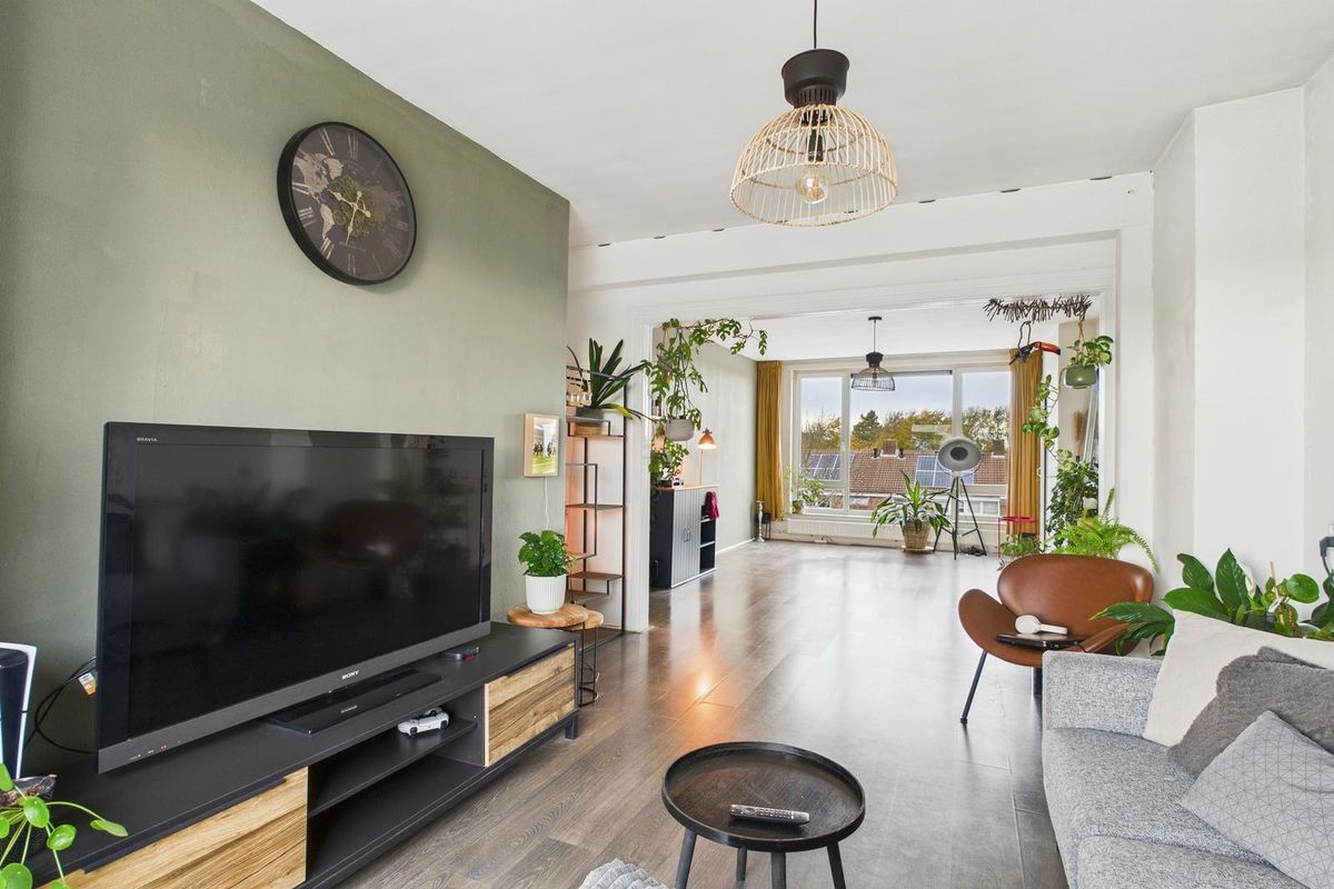 Je komt binnen in de ruime hal, waarvandaan je toegang hebt tot alle vertrekken. De woonkamer valt direct op door de grote ramen en de hoge ligging, waardoor er veel daglicht binnenkomt en je weids uitzicht hebt over de straat.