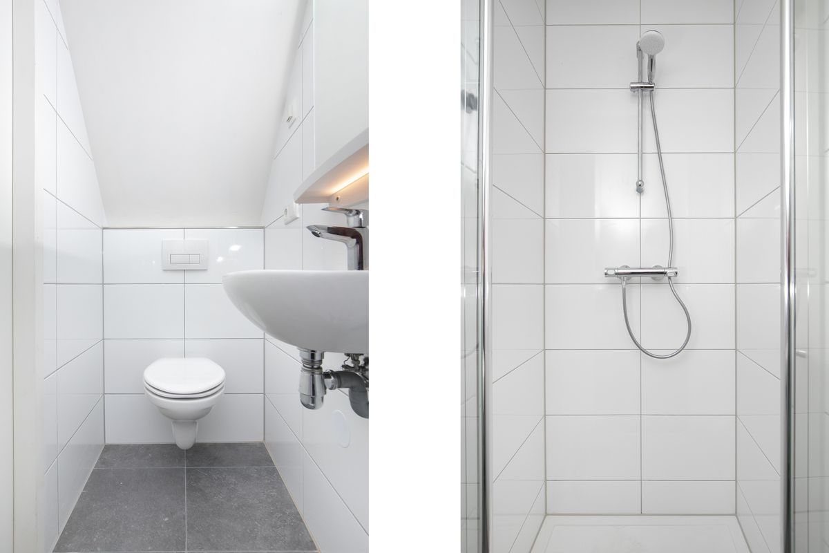 There is also a washing machine and dryer. The bathroom has shower and washbasin and toilet. At the backside of the apartment is the bedroom with a double bed and a wardrobe.