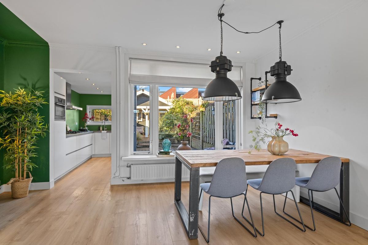 Via de sfeervolle hal met jaren 30 tegellambrisering kom je de woning binnen. Hier vind je allereerst een praktische trapkast en het toilet. Vervolgens loop je door en sta je midden in de woonkamer. Aan de voorzijde bevindt zich een knusse zithoek met erker, waar je heerlijk uitkijkt over de straat zonder dat buren direct bij je naar binnen kijken. Aan de achterzijde vind je het eetgedeelte met plek voor een ruime eettafel. Aan de linkerzijde zit een gezellig nisje dat je voor meerdere doeleinden kunt gebruiken zoals een extra zithoek, werkplek of meubelstuk. Aansluitend loop je via een open doorgang naar de keuken. De keuken is licht door het raam aan de achterzijde en de deur aan de zijkant. De moderne L opstelling is voorzien van inbouwapparatuur zoals een gaskookplaat met afzuigkap, koelkast, combioven en vaatwasser. Via de deur in de keuken stap je zo de achtertuin in.