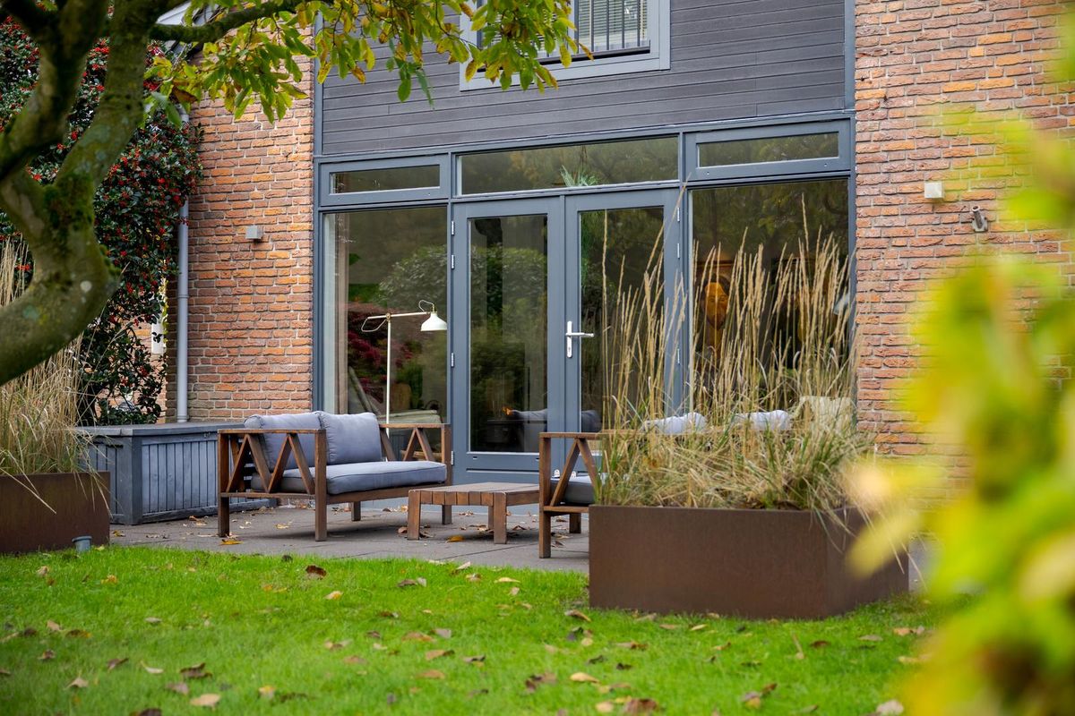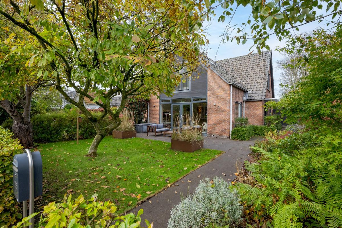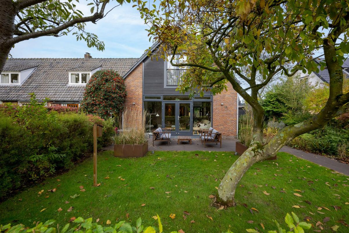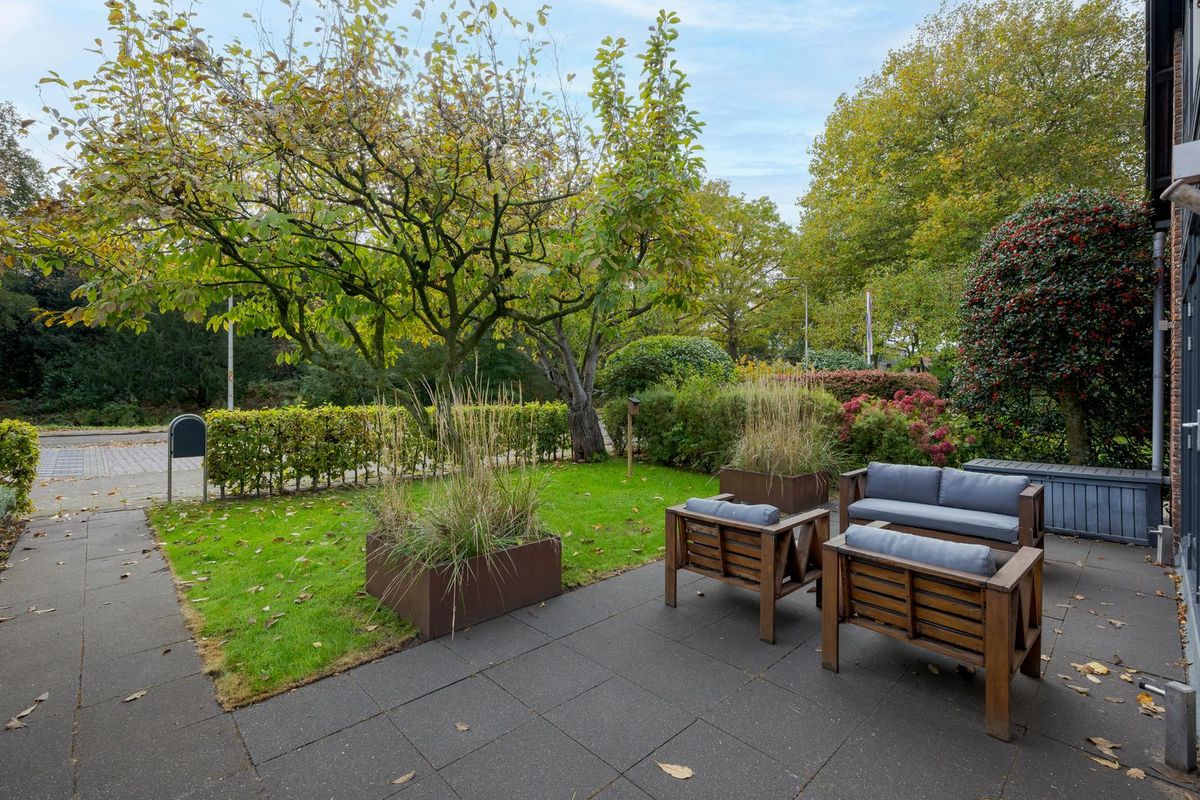 In de modern aangelegde tuin treft men een groot terras met overkapping. Via een pad langs het huis en een grasveld met vijver bereik je een eigen parkeerplaats met laadstation en nog een zitgedeelte achterin de tuin met toegang tot de berging.