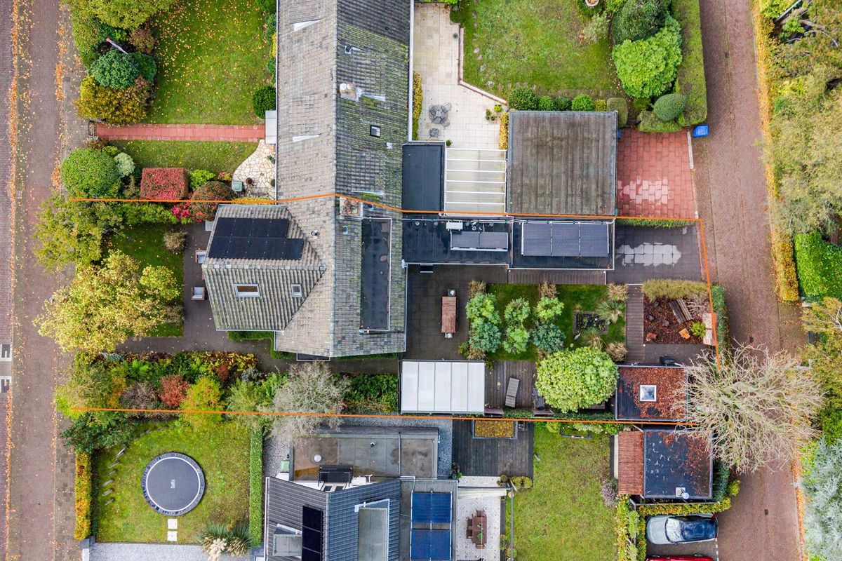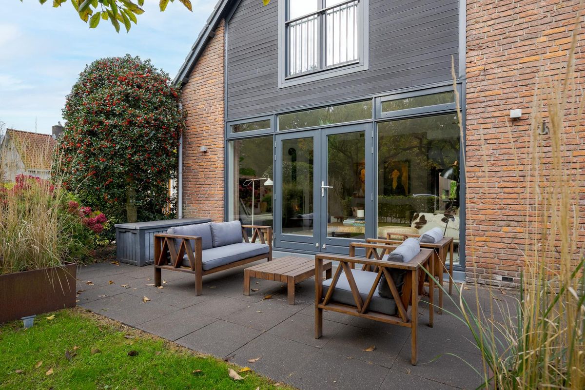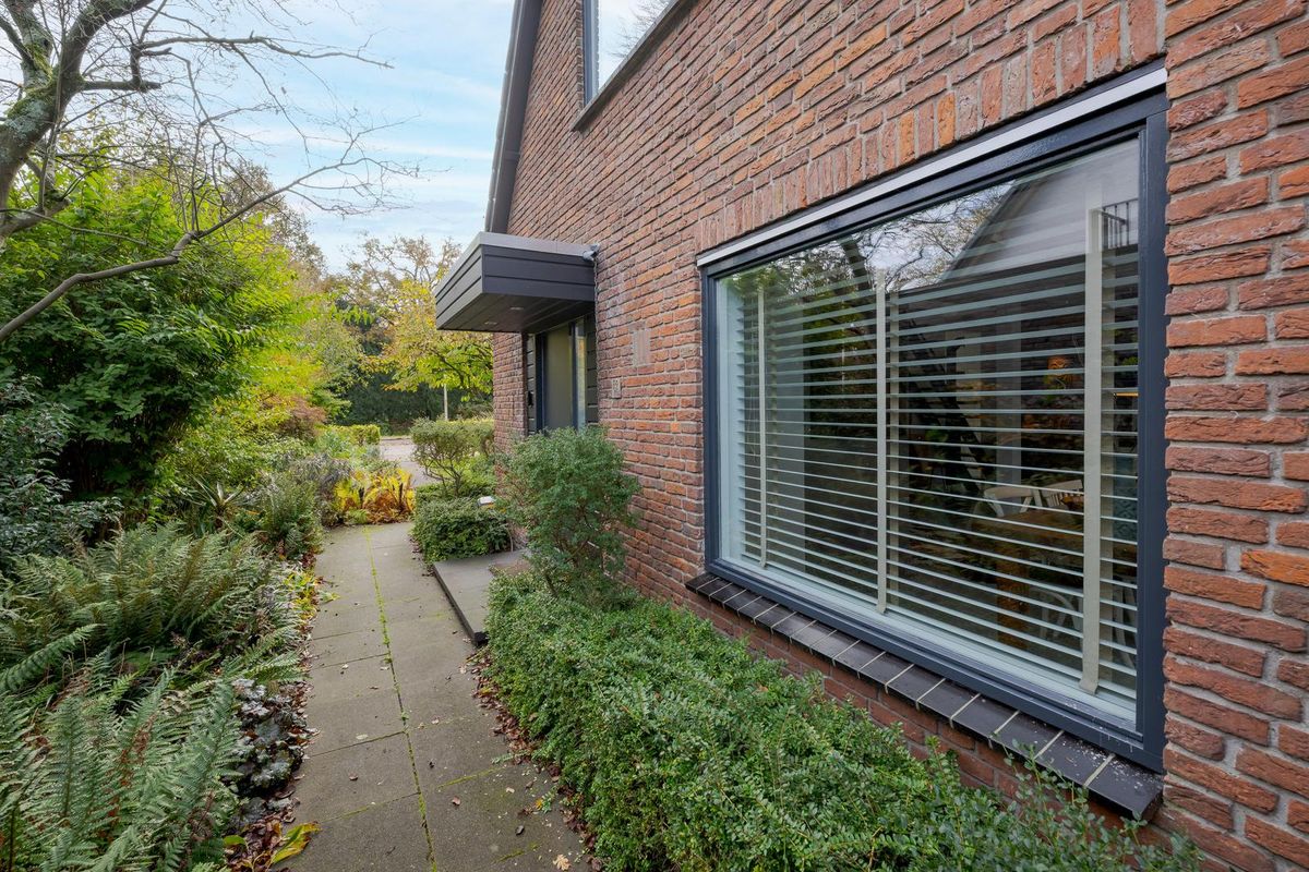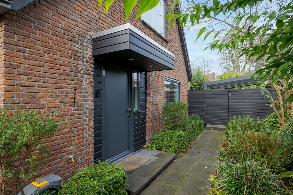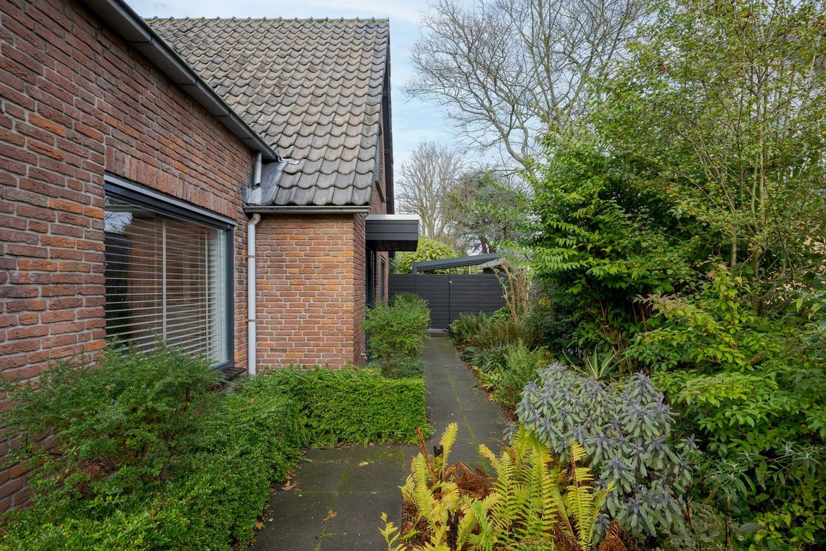 In de modern aangelegde tuin treft men een groot terras met overkapping. Via een pad langs het huis en een grasveld met vijver bereik je een eigen parkeerplaats met laadstation en nog een zitgedeelte achterin de tuin met toegang tot de berging.