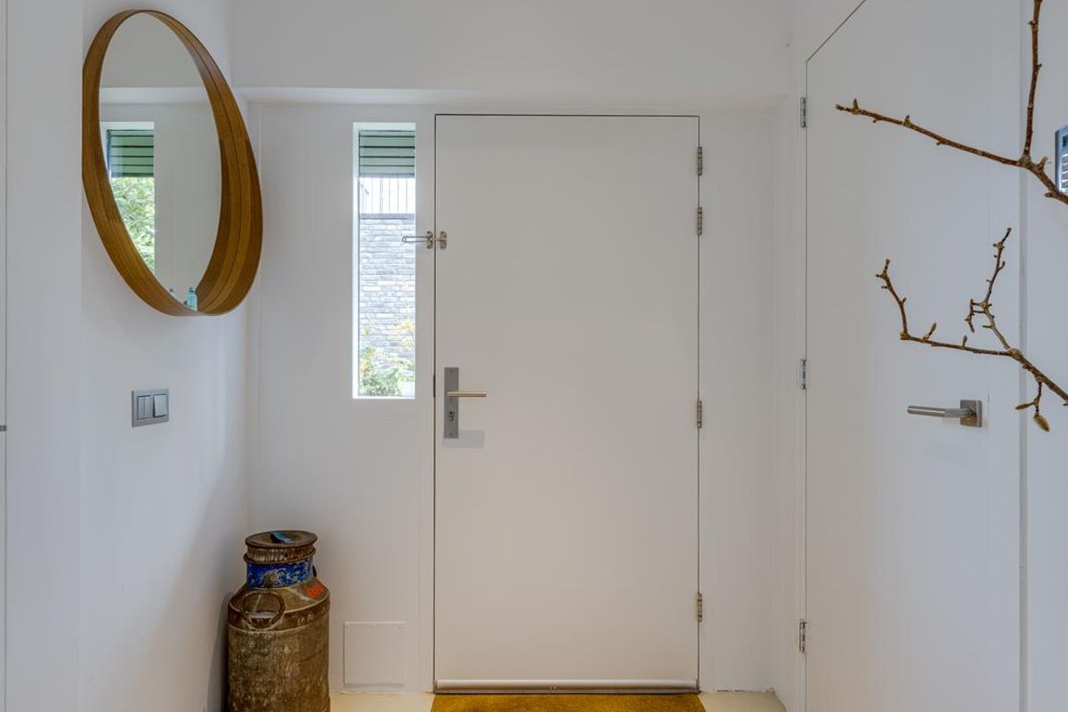 Begane grond: Voortuin en entree van de woning aan de rechterkant. In de hal bevindt zich een kast, de meterkast en de deur naar de keuken en eethoek. Direct links tref je de gezellige woonkamer met openslaande deuren naar het terras in de voortuin. Vanaf de eethoek heb je zicht op de moderne woonkeuken met veel kastruimte en inbouwapparatuur en kijk je uit op de achtertuin. Langs de keuken naar de achterzijde kijkend tref je een zeer lichte corridor, met een raampartij tot aan plafond en vloer, met verschillende deuren naar berg- en kastruimte en een separaat toilet. Aan het einde van de hal tref je een kamer, die als slaapkamer of studeerkamer gebruikt kan worden.
