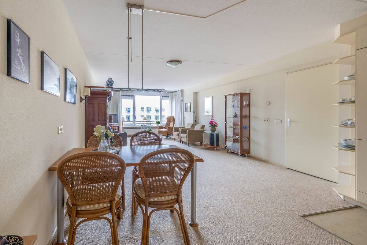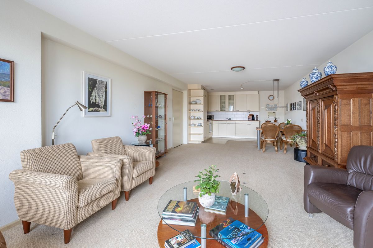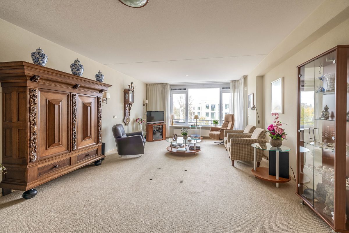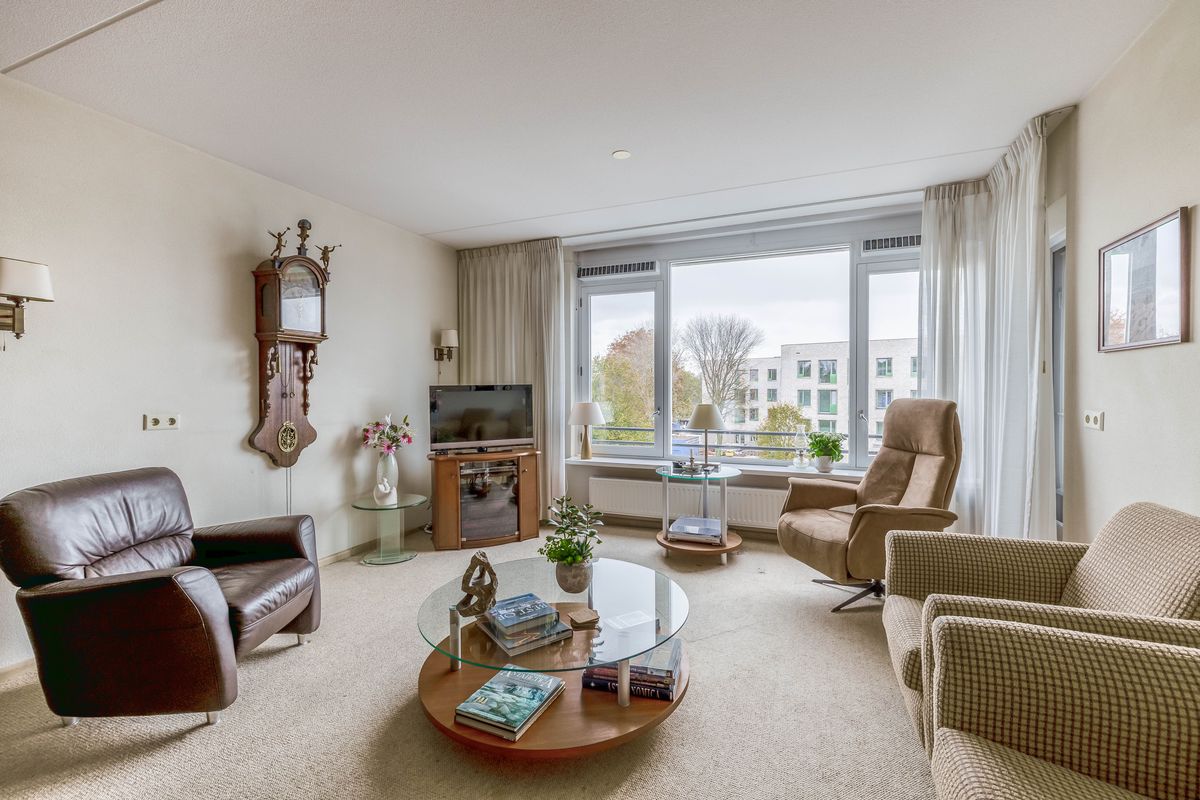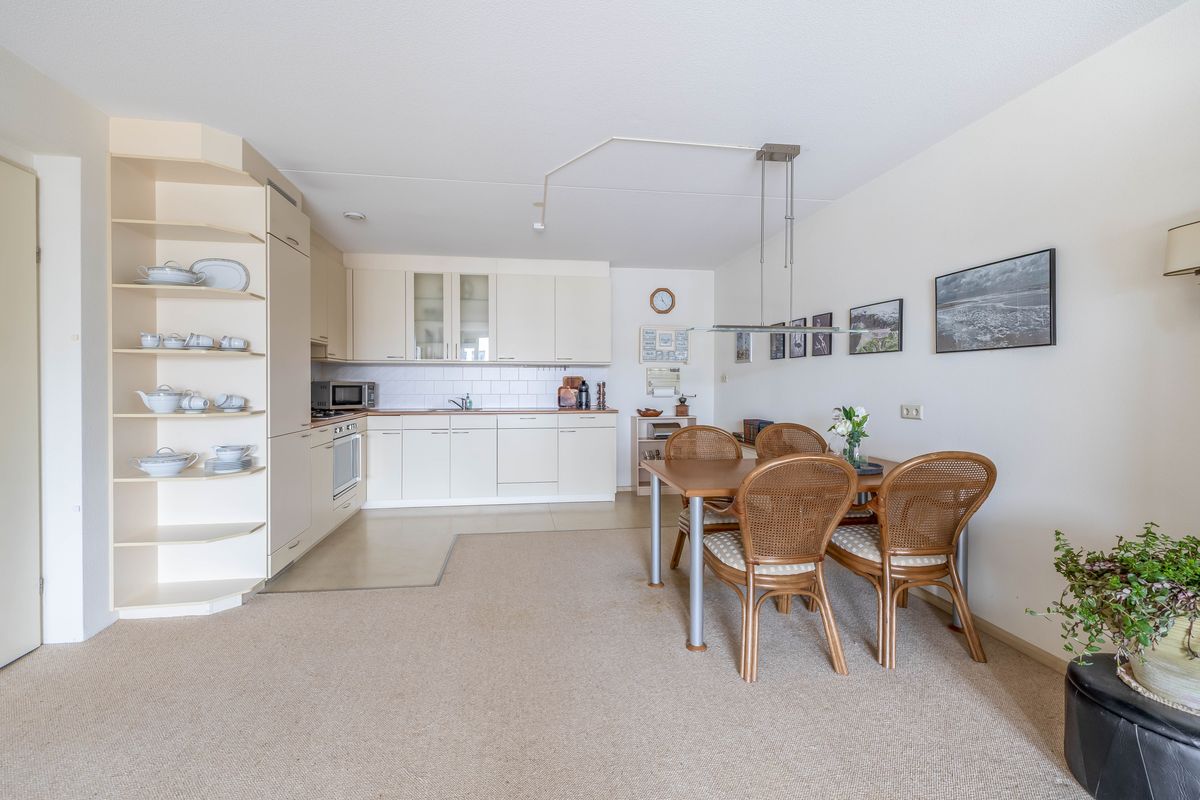 De ruime en lichte woonkamer ligt eveneens aan de achterzijde en biedt een fraai uitzicht over de omgeving - een uitzicht dat eigenlijk nooit verveelt. Vanuit de woonkamer heb je toegang tot het deels inpandige balkon van circa 11 m². De woonkamer staat in open verbinding met de keuken en samen vormen zij een royale leefruimte van ongeveer 44 m².