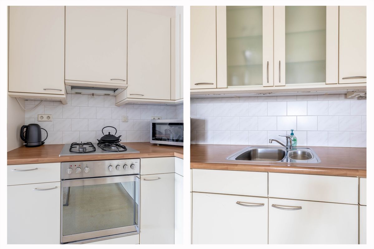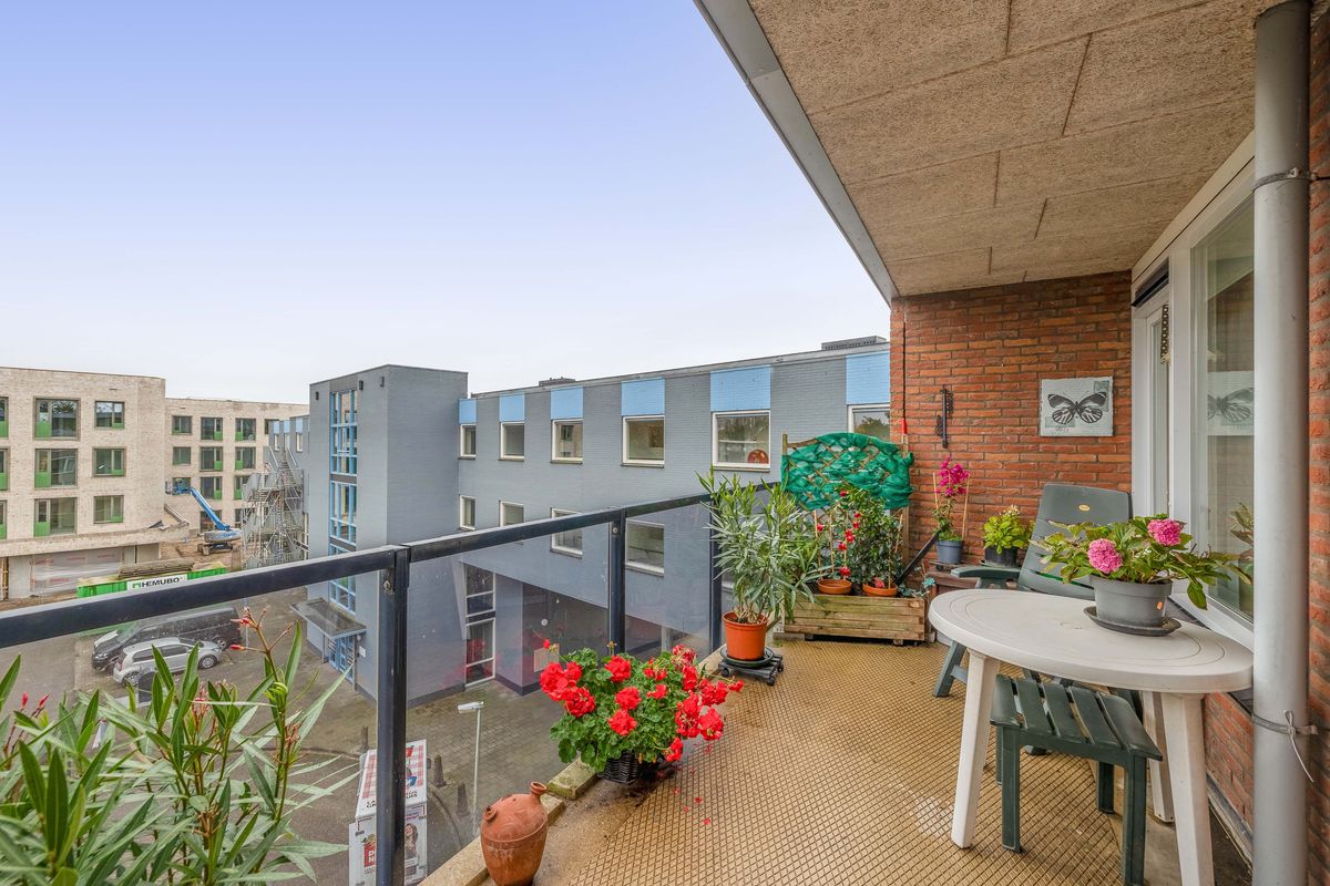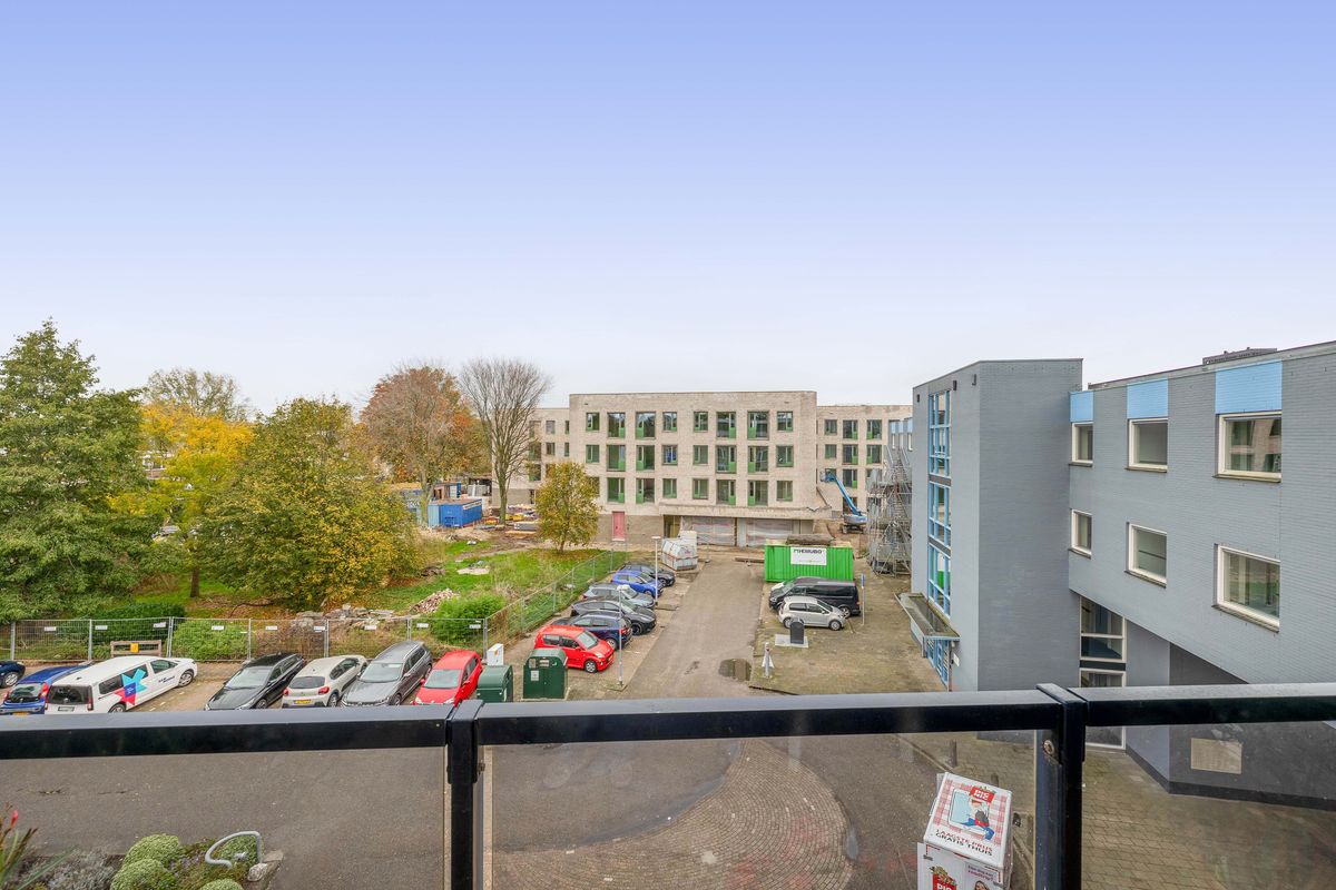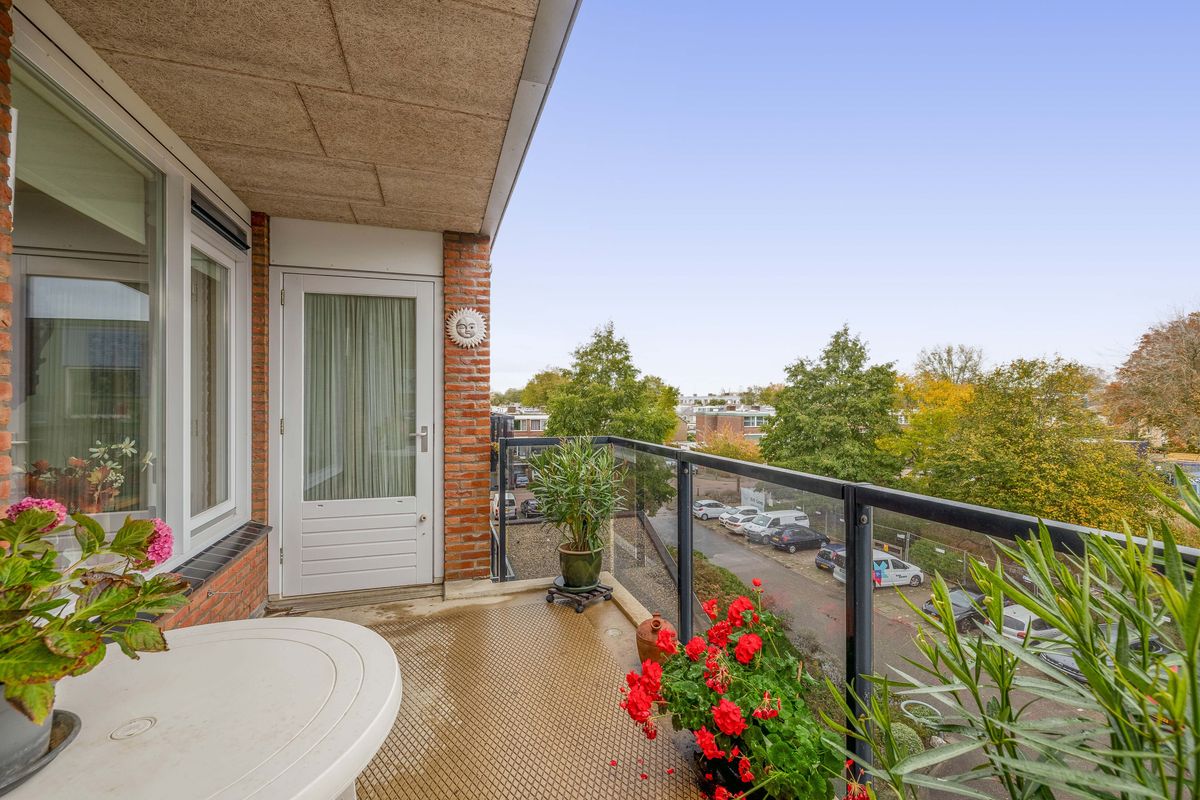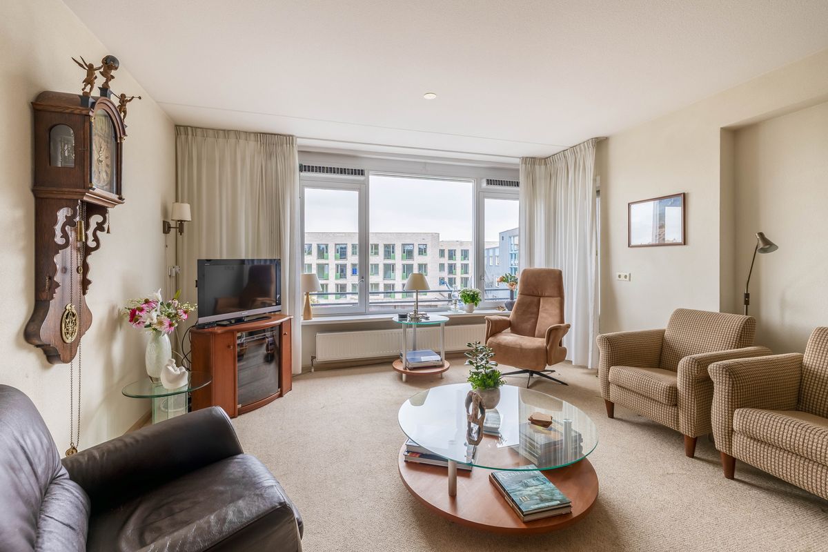 De ruime en lichte woonkamer ligt eveneens aan de achterzijde en biedt een fraai uitzicht over de omgeving - een uitzicht dat eigenlijk nooit verveelt. Vanuit de woonkamer heb je toegang tot het deels inpandige balkon van circa 11 m². De woonkamer staat in open verbinding met de keuken en samen vormen zij een royale leefruimte van ongeveer 44 m².