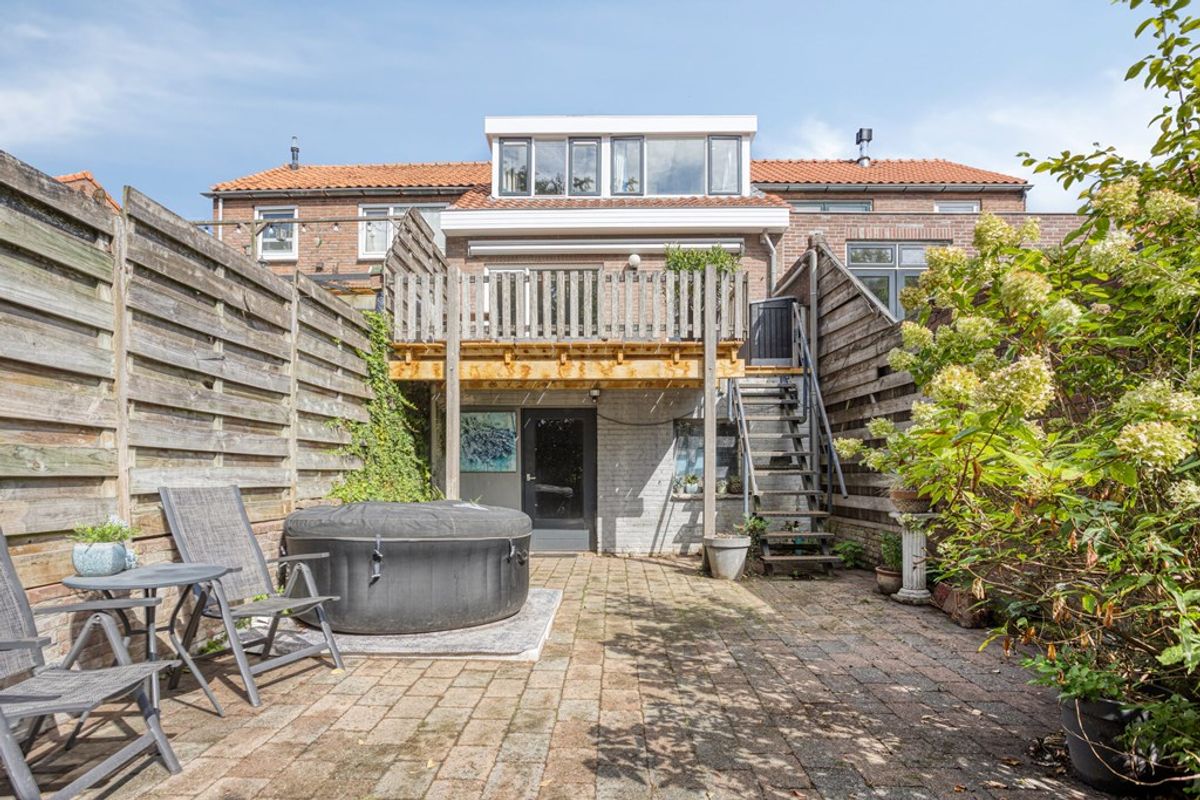 Vanuit de keuken loopt u het verhoogde terras op. Het terras biedt voldoende plek voor een loungeset en kijkt uit over de lager gelegen tuin. Via een trap bereikt u de tuin, waar de onderhoudsarme bestrating wordt afgewisseld met groene beplanting. Er is volop ruimte om een buitentafel of extra loungeset te plaatsen. De zonnige ligging maakt dit tot een heerlijke plek om in alle rust te genieten.
