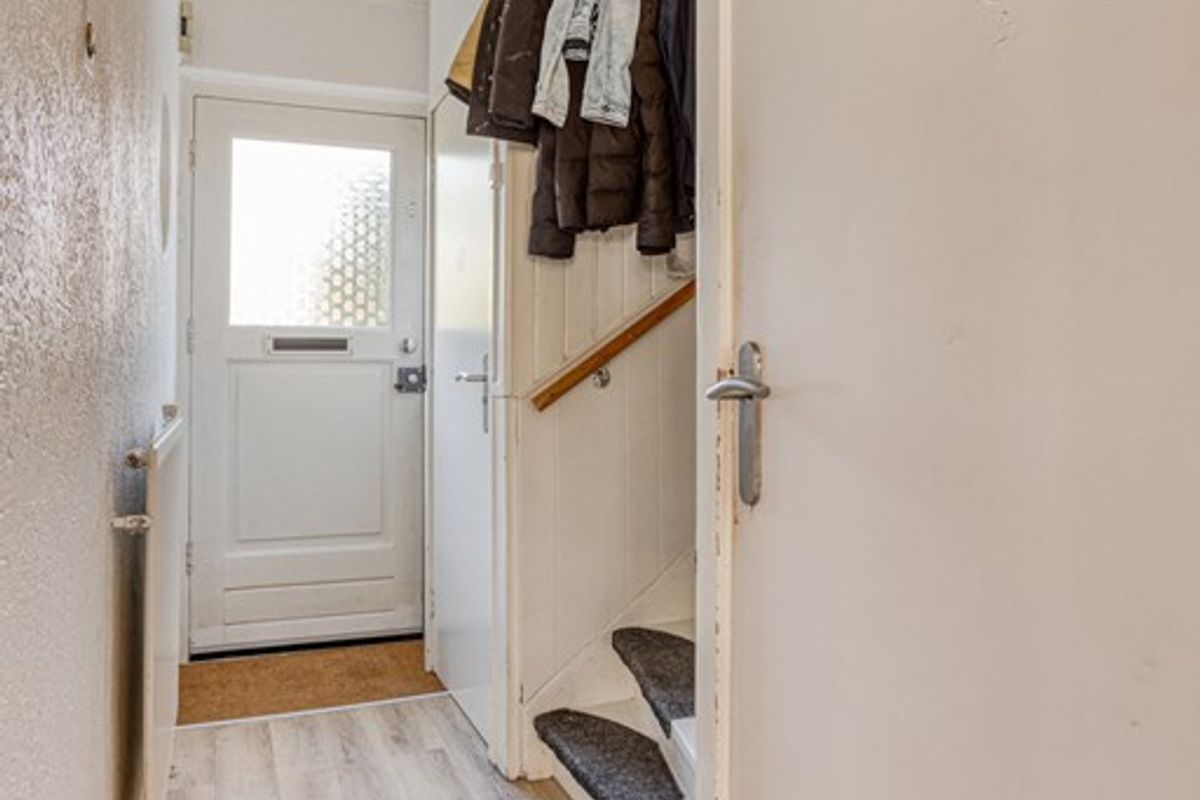 Bij binnenkomst betreedt u de woning via de groene voortuin. In de hal heeft u toegang tot het toilet, de trap naar de eerste verdieping en het souterrain. De hal biedt voldoende plek voor een kapstok en opbergmeubel, waardoor u altijd een praktische entree heeft.