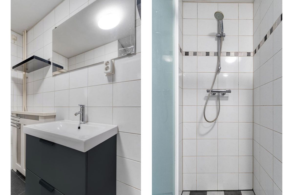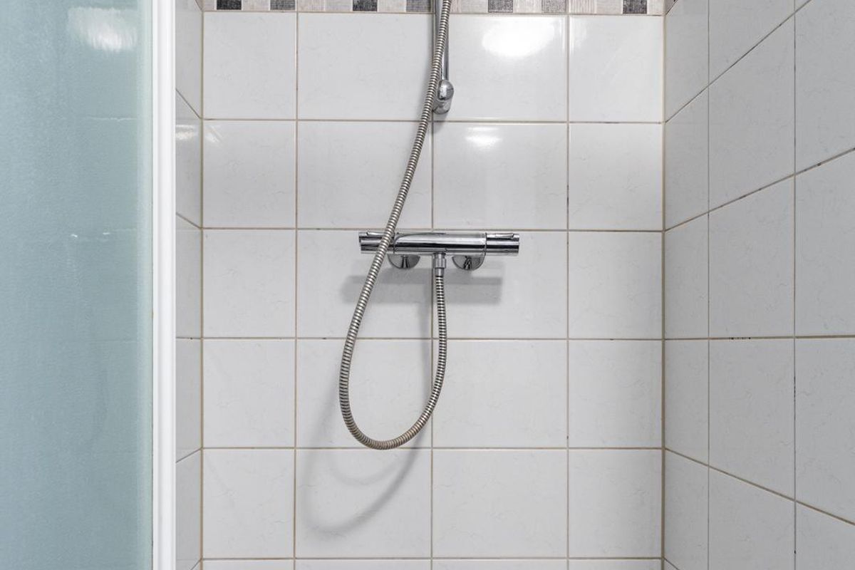 Ruime badkamer met douchecabine, wastafel met meubel. In de badkamer bevindt zich ook