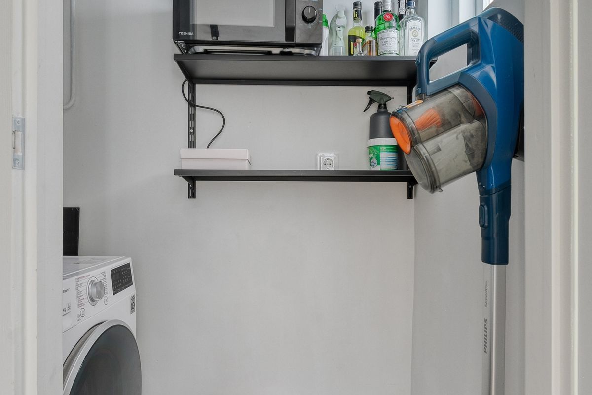 Op de begane grond bevindt zich de entree met meterkast en separaat toilet met fontein. Vanuit hier kom je in de ruime en lichte woonkamer met een moderne afwerking, open trap naar de eerste verdieping en openslaande deuren naar de tuin. Dankzij de hoge plafonds en grote raampartijen geniet de woonkamer de hele dag van een optimale lichtinval. In de uitbouw, aan de achterzijde van de woning, ligt de luxe keuken (Kvik, 2022) die is uitgerust met hoogwaardige AEG-apparatuur, waaronder een vaatwasser, oven en inductiekookplaat. Vanuit de keuken is er tevens toegang tot de zonnige patiotuin, die in 2023 volledig vernieuwd is. De ruime bergkast met aansluitingen voor wasapparatuur en cv-ketel is via de keuken bereikbaar.