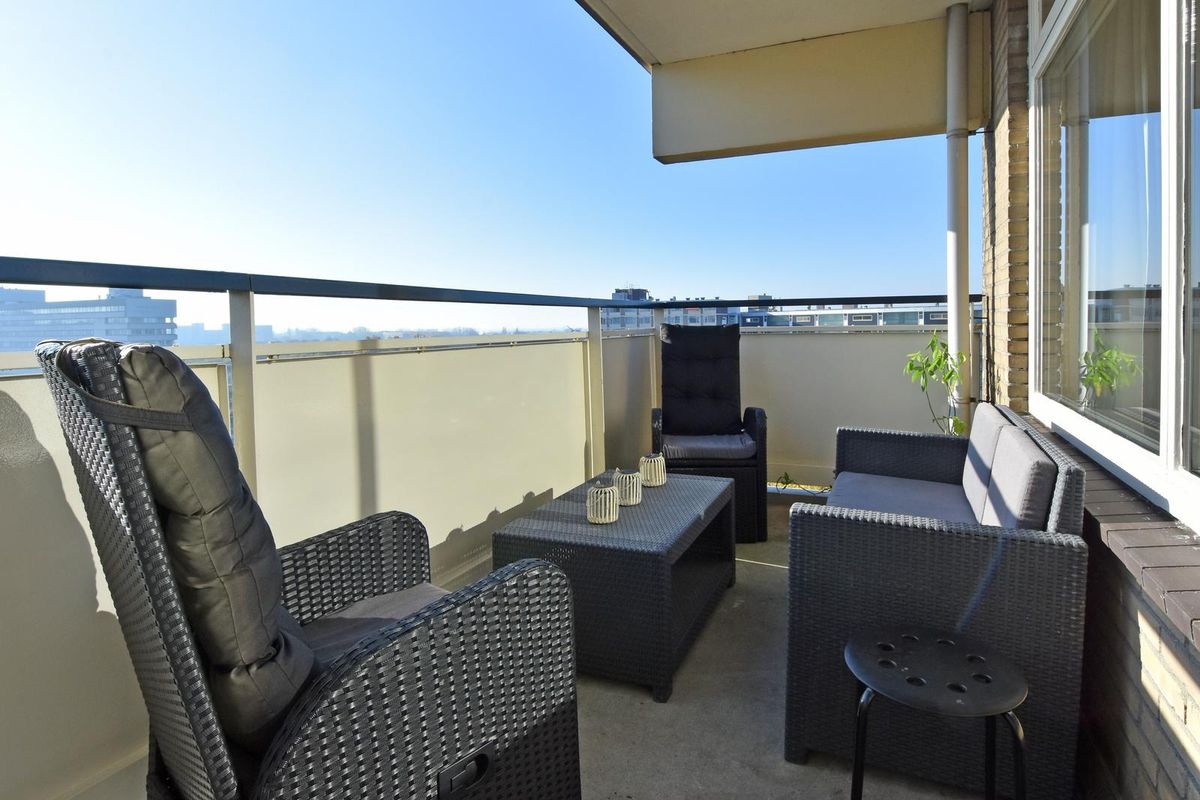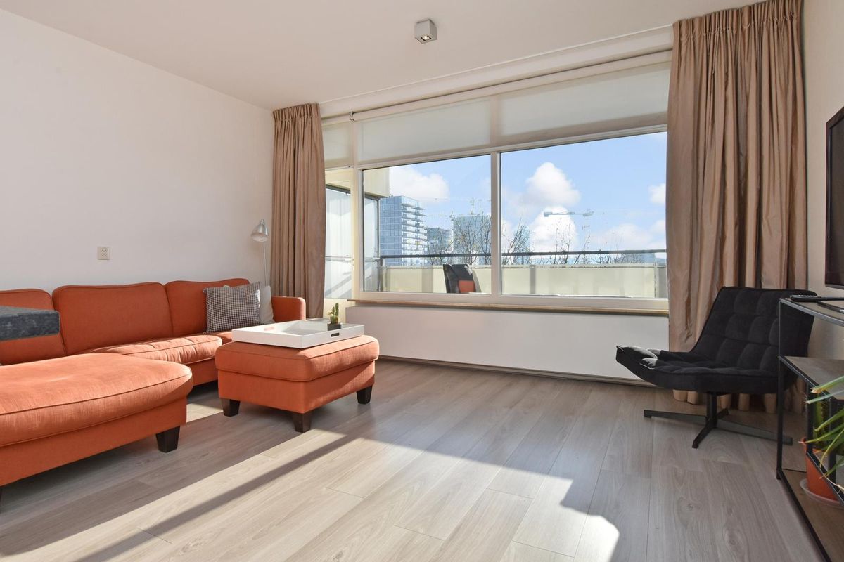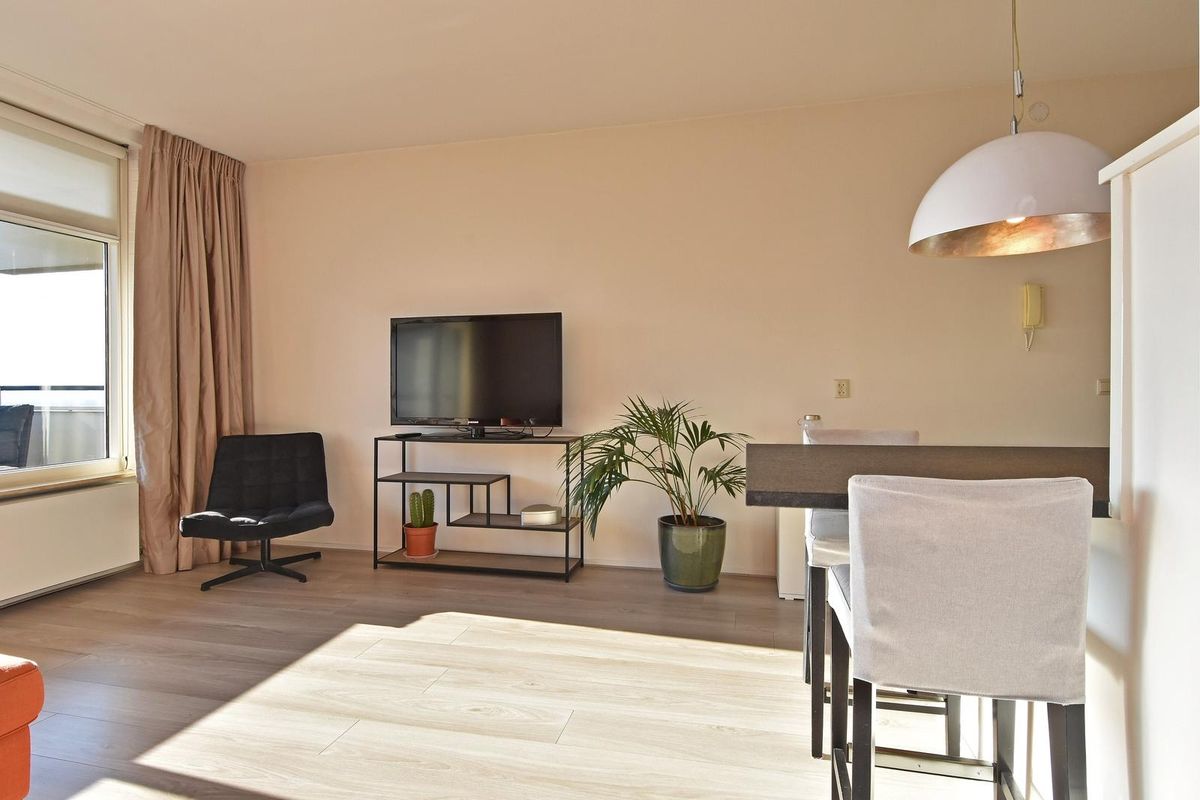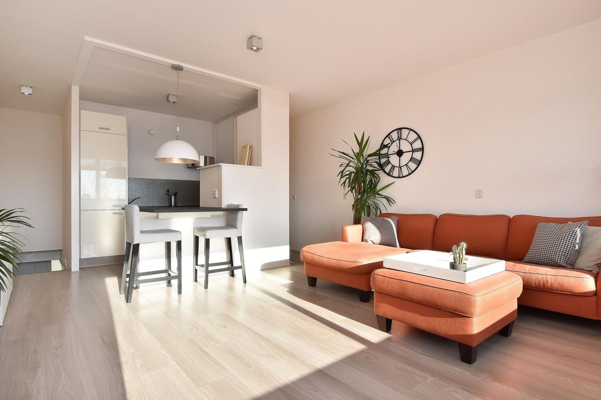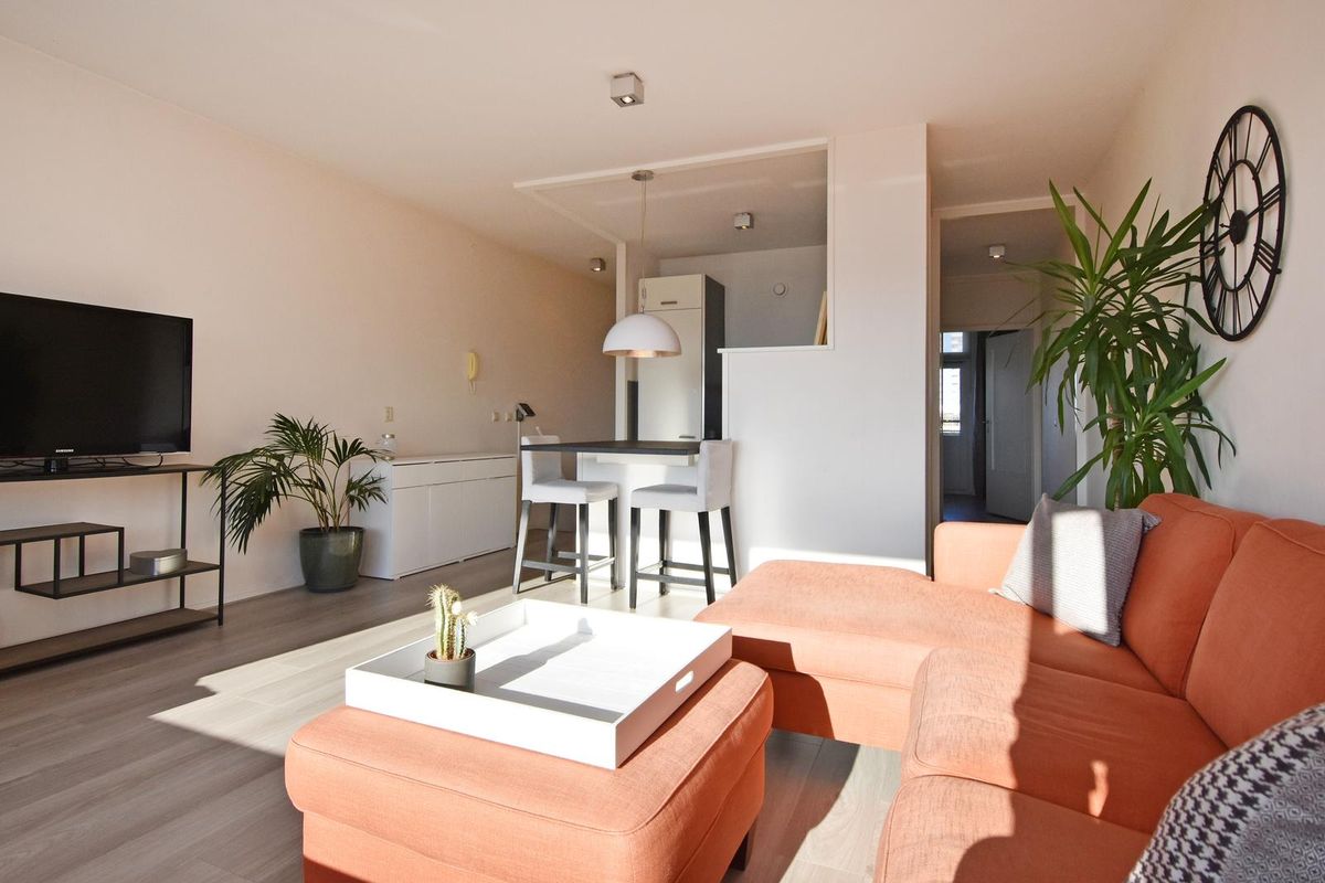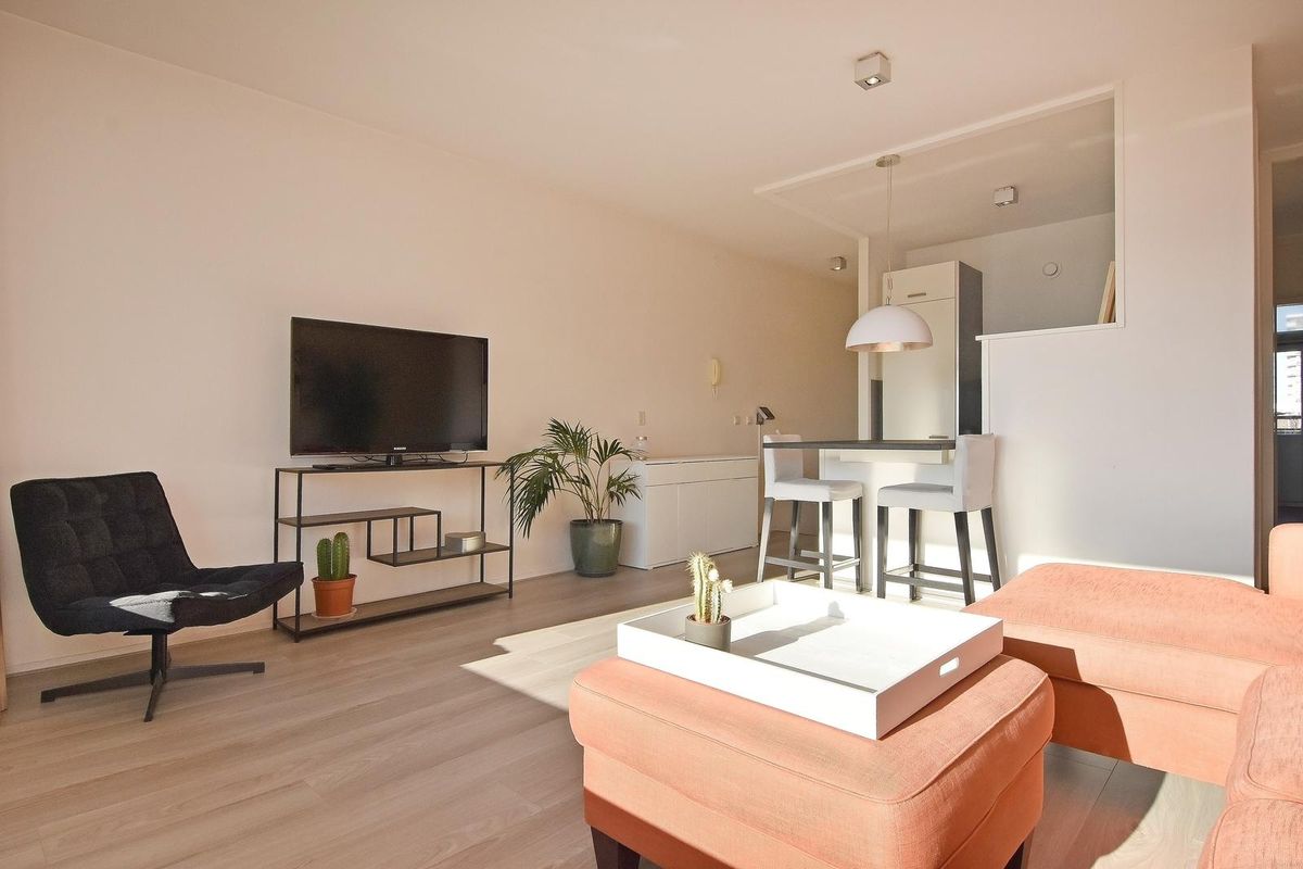 Het appartement is volledig ingericht en instapklaar. De ruime woonkamer met open keuken is smaakvol gemeubileerd en voorzien van grote raampartijen die zorgen voor veel lichtinval. De keuken is uitgerust met diverse inbouwapparatuur, waaronder een koelkast, oven, kookplaat, afzuigkap en vaatwasser.