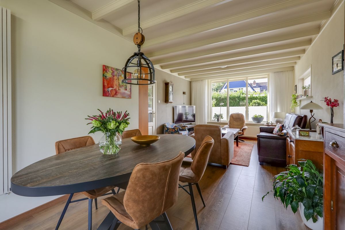 Bij binnenkomst in het huis kom je in de entreehal, waar zich de garderobe, de trap naar de eerste verdieping, het toilet en de meterkast bevinden. De gezellige woonkamer biedt voldoende ruimte voor een zithoek en een eettafel, bijvoorbeeld voor zes personen. Via de schuifpui heb je toegang tot de overkapping met zicht over de eigen achtertuin. De gesloten keuken is voorzien van een inductiekookplaat, oven, afzuigkap, koelkast en een vaatwasser.