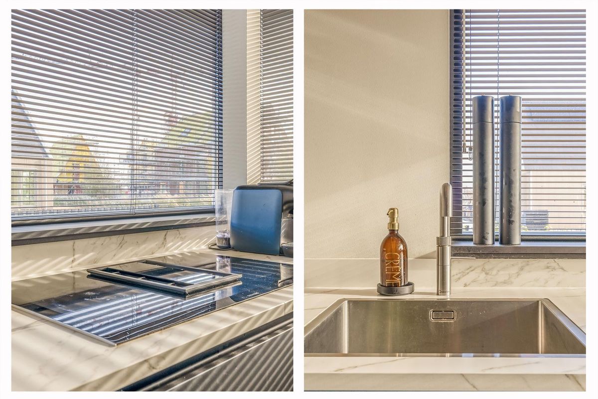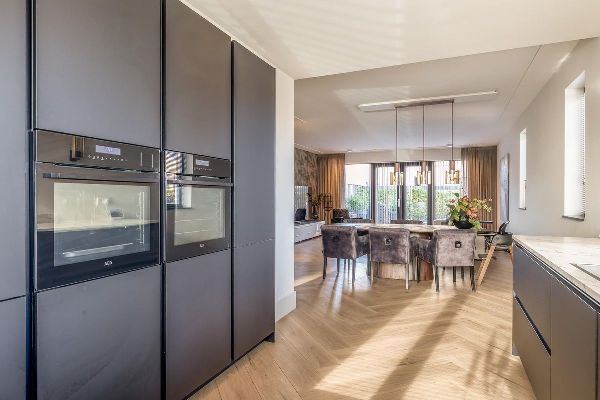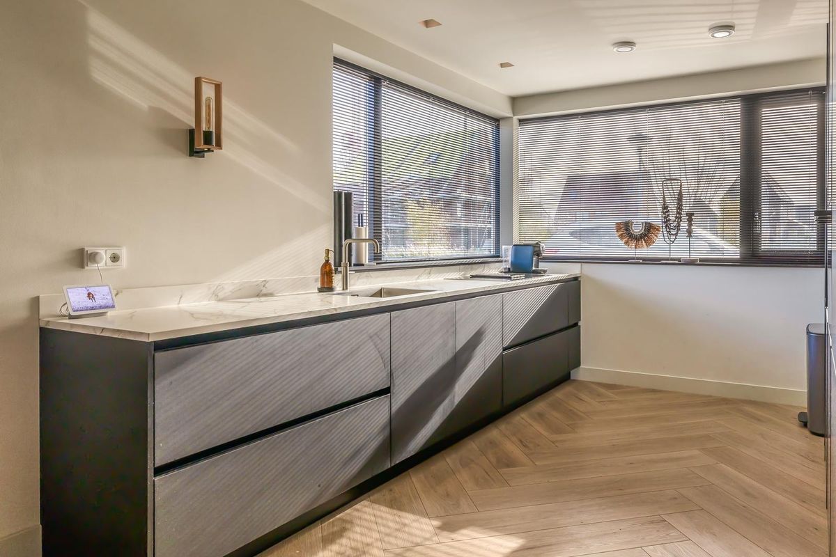 Via de keurig aangelegde voortuin bereik je de voordeur. Binnen valt direct de verzorgde en stijlvolle afwerking op: strak, modern en met oog voor detail. Het plafond is verlaagd voor inbouwspots en de wanden zijn voorzien van fraai betonstuc. De lichte, tuingerichte woonkamer loopt vloeiend over in de moderne open keuken, uitgevoerd in parallelopstelling en voorzien van alle gemakken: een inductiekookplaat met geïntegreerde afzuiging, koel-vriescombinatie, combi-stoomoven, elektrische oven, vaatwasser en Quooker.