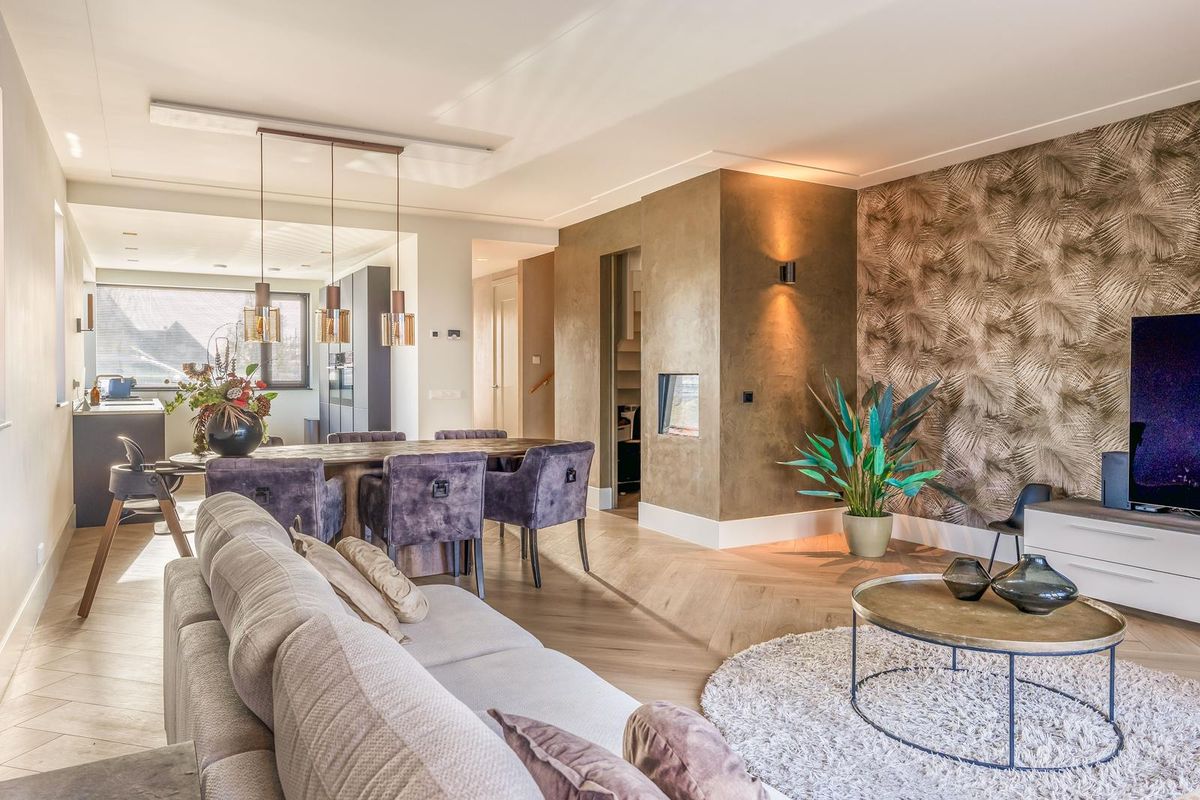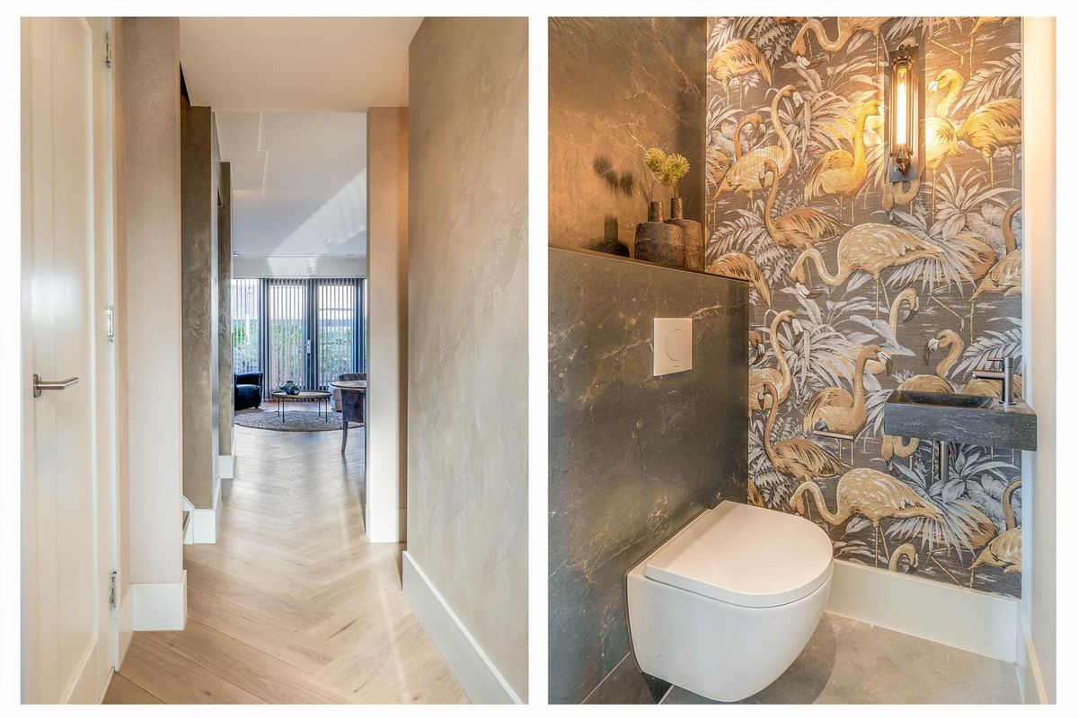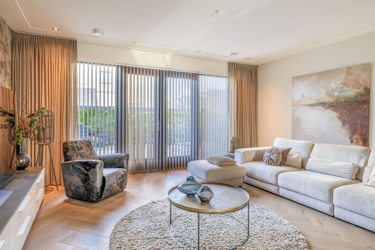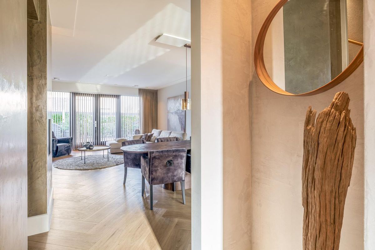 Via de keurig aangelegde voortuin bereik je de voordeur. Binnen valt direct de verzorgde en stijlvolle afwerking op: strak, modern en met oog voor detail. Het plafond is verlaagd voor inbouwspots en de wanden zijn voorzien van fraai betonstuc. De lichte, tuingerichte woonkamer loopt vloeiend over in de moderne open keuken, uitgevoerd in parallelopstelling en voorzien van alle gemakken: een inductiekookplaat met geïntegreerde afzuiging, koel-vriescombinatie, combi-stoomoven, elektrische oven, vaatwasser en Quooker.
