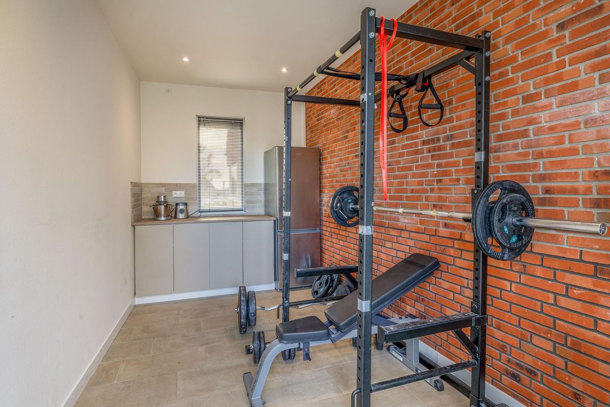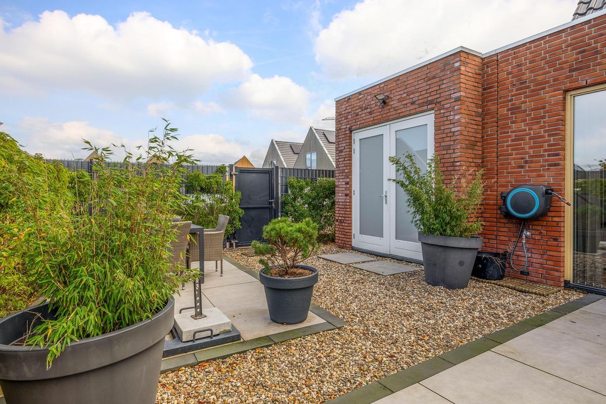 Aan de achterzijde bevindt zich de aangebouwde stenen berging met dubbele deur, tegelvloer en praktische kastenwand – ideaal voor fietsen, gereedschap of hobbyspullen. Ook een buitenkraan is aanwezig.
