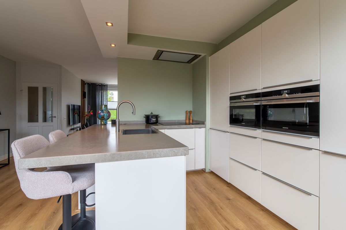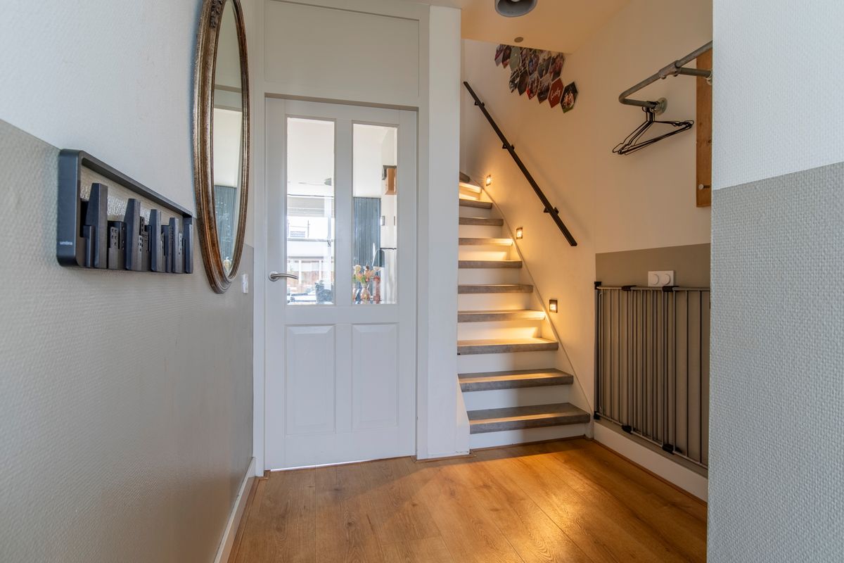 Begane grond: Via de entree bereiken we de hal. Hier zien we de trap naar de eerste verdieping en deuren naar de meterkast en het toilet met een fonteintje. De woonkamer betreft een woonkamer met een Z-vormige indeling. En geloof ons maar, niets is fijner dan dat. Een riant zitgedeelte aan de voorkant van het huis en een praktisch eetgedeelte aan de achterkant, naast de keuken. Over de keuken gesproken, deze keuken heeft een U-vormige opstelling met witte fronten. Het aanwezige barretje wordt door uw kinderen ongetwijfeld gewaardeerd als u aan het koken bent maar resulteert ook in extra kastruimte. Aan inbouwapparatuur is er in de keuken aanwezig een inductie kookplaat, een afzuigkap, een koelkast, een afzonderlijke en extra grote vriezer, een stoomoven, een combi-oven en een Quooker. Completer kan bijna niet.