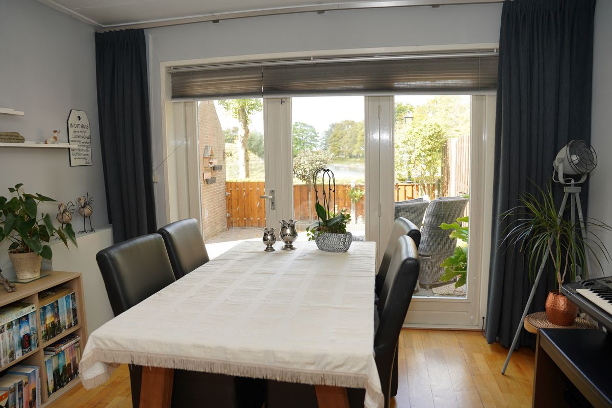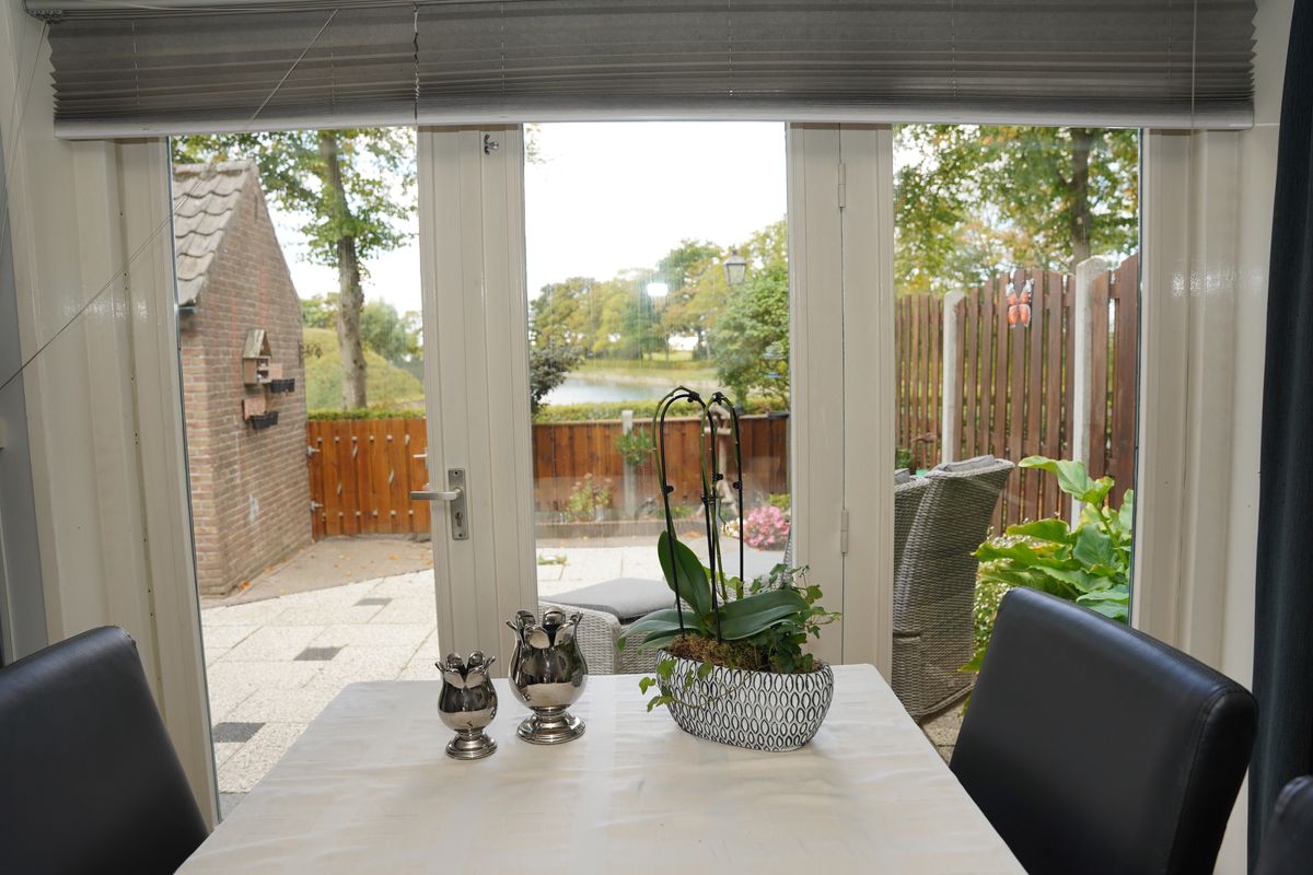 Vanuit de achtertuin geniet je van een prachtig uitzicht over een waterpartij en het groen.