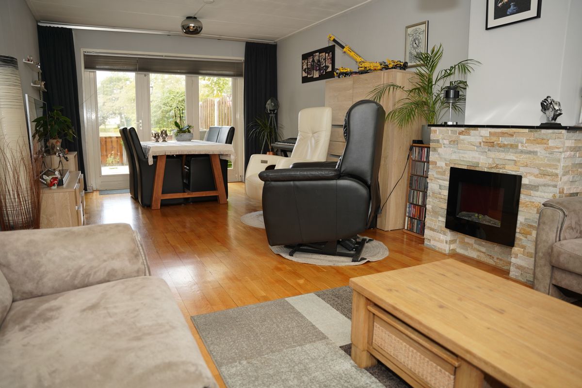 De uitgebouwde woonkamer is voorzien van een parketvloer en een sierschouw. Dankzij de tuindeuren is er aangenaam veel lichtinval en loopt binnen naadloos over in buiten.