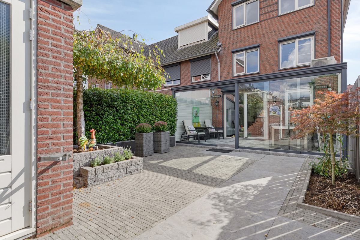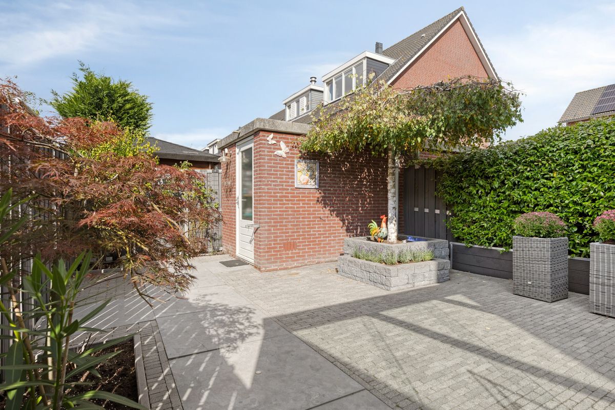 De tuin is verzorgd en onderhoudsvriendelijk aangelegd, met een groot terras, borders en een stenen berging met elektra. Zowel aan de voor- als achterzijde is er voldoende buitenruimte om in alle seizoenen van de zon te genieten.