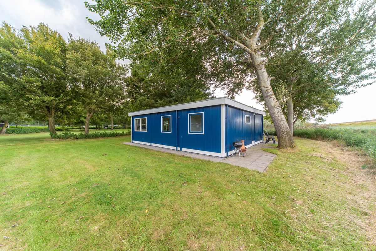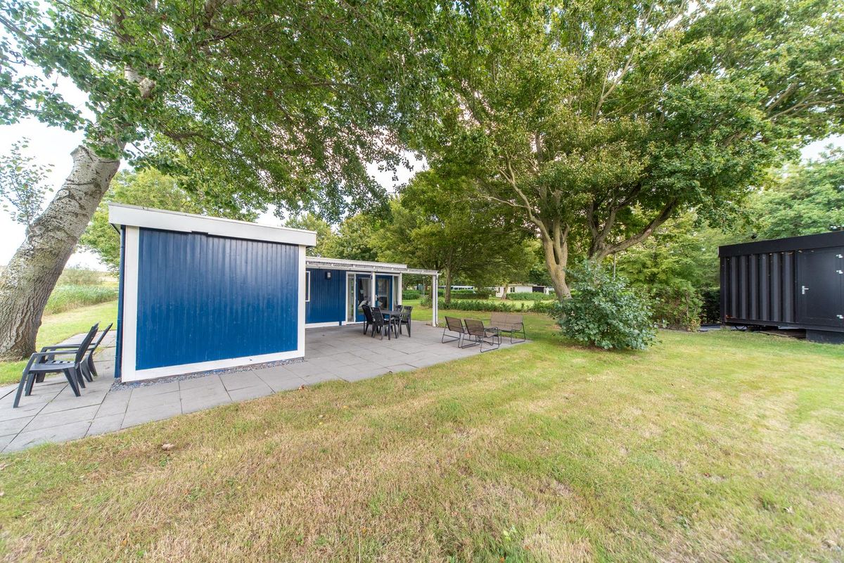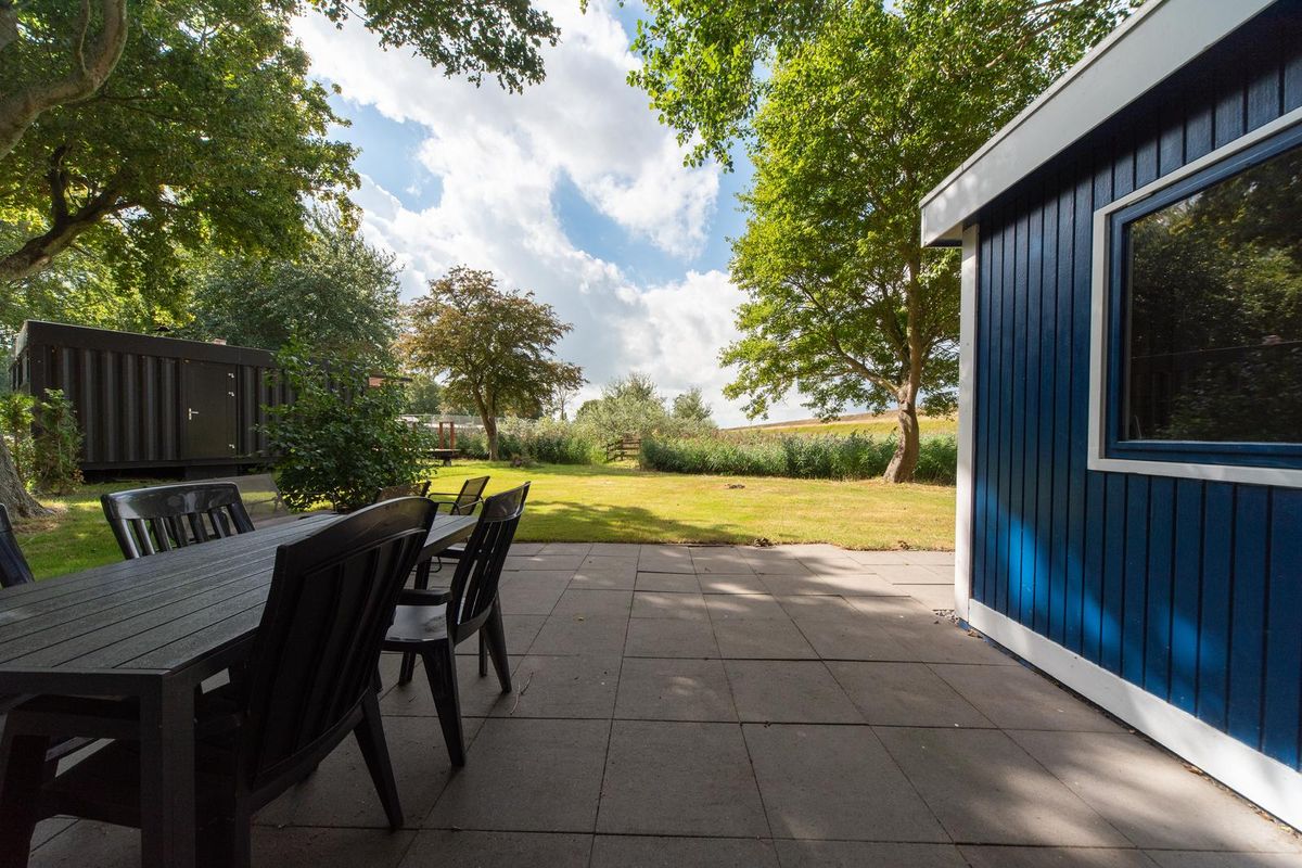 Aan de zijkant bevindt zich over de gehele lengte van het chalet een overkapping boven het betegelde terras, de openslaande deuren en de voordeur. Erg makkelijk als u met volle boodschappentassen tijdens een plotselinge regenbui uw sleutels nog moet zoeken om de voordeur open te maken of een mogelijkheid om toch het wasrek nog even buiten weg te zetten als het onverhoopt gaat regenen.