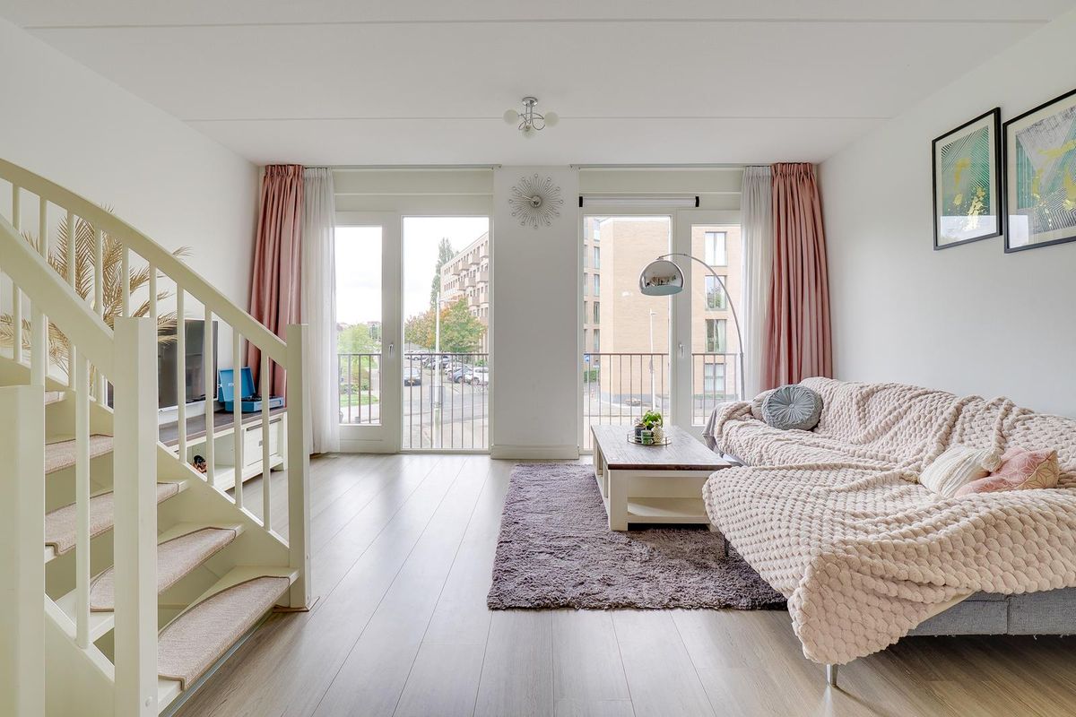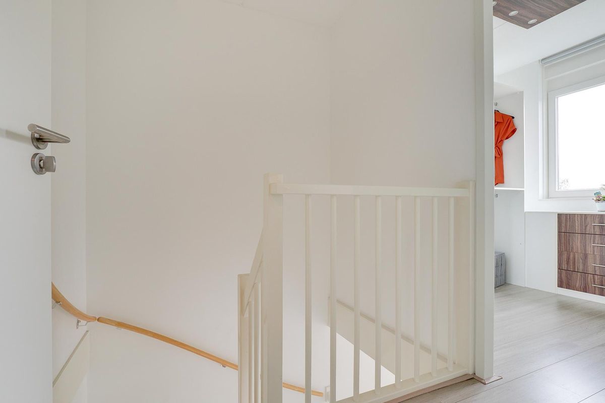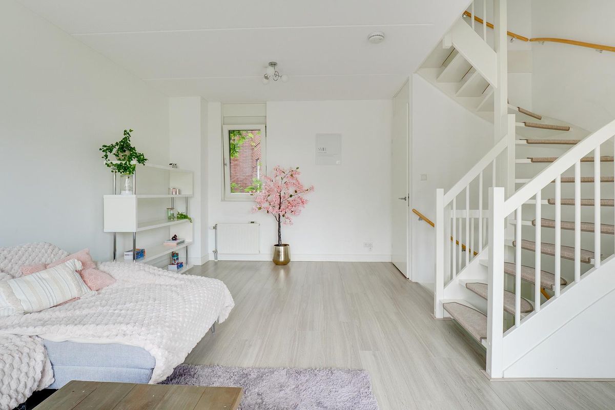 • Eerste verdieping: lichte woonkamer van ca. 26 m². De speelse positie van de trap in de woonkamer zorgt voor ruimtelijkheid en interessante zichtlijnen; door het vele glas heb je een fijn uitzicht en veel daglicht, een echte plek om te relaxen of juist geconcentreerd te werken.