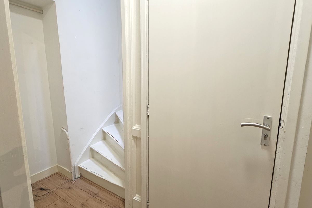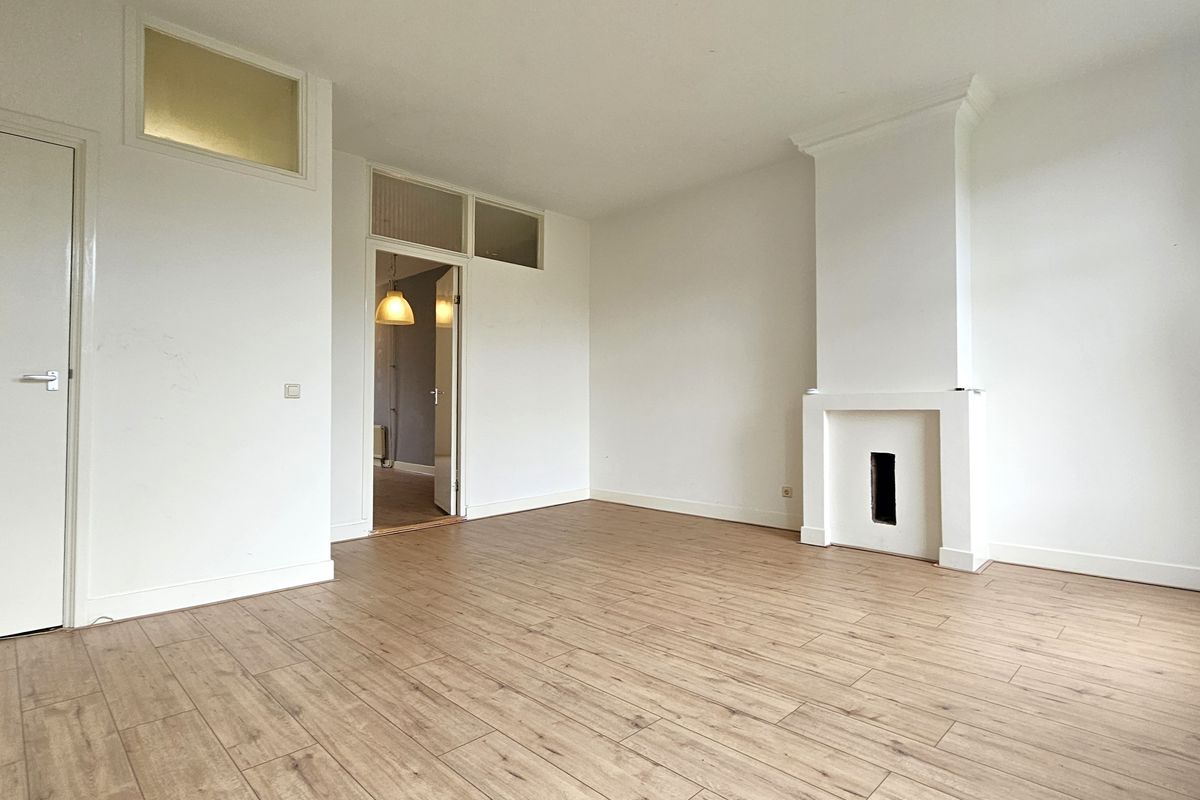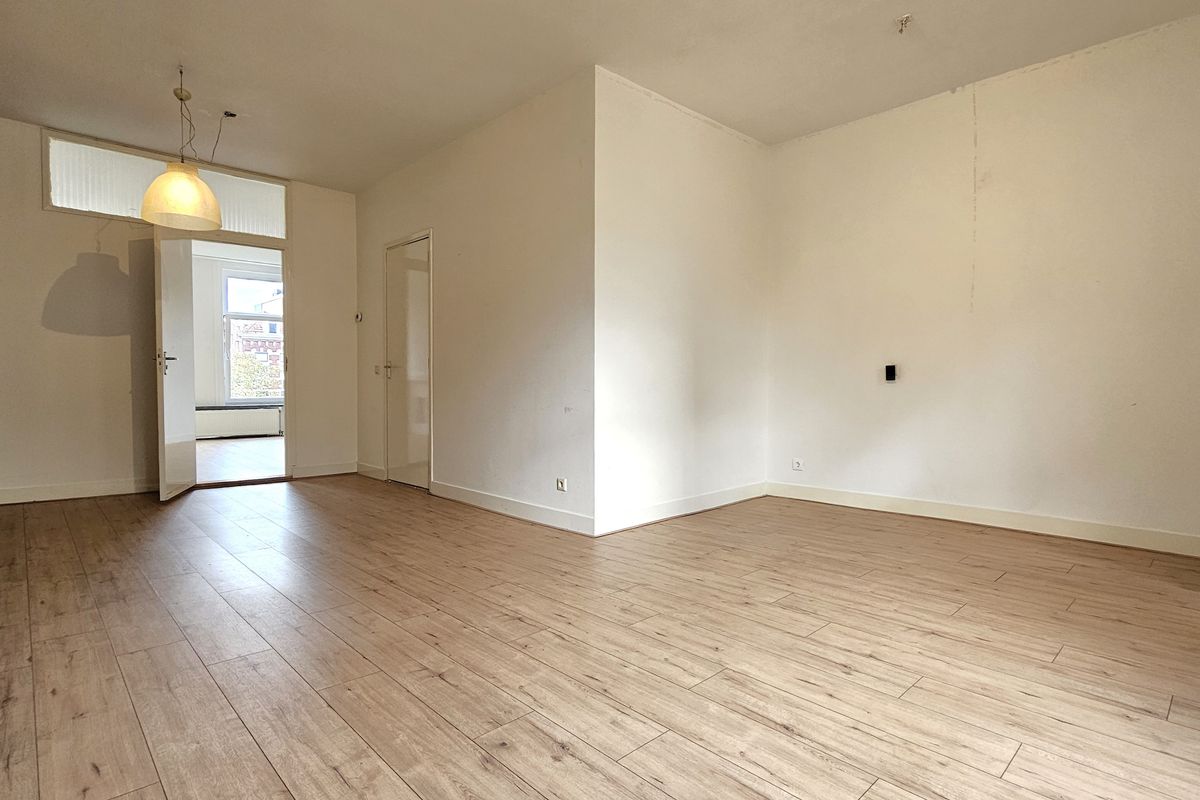 Tweede verdieping: een lichte woonkamer met hoge plafonds, een halfopen keuken (vernieuwd eind 2021) en een aangrenzende voor-(slaap)kamer. In de hal bevindt zich een separaat toilet.