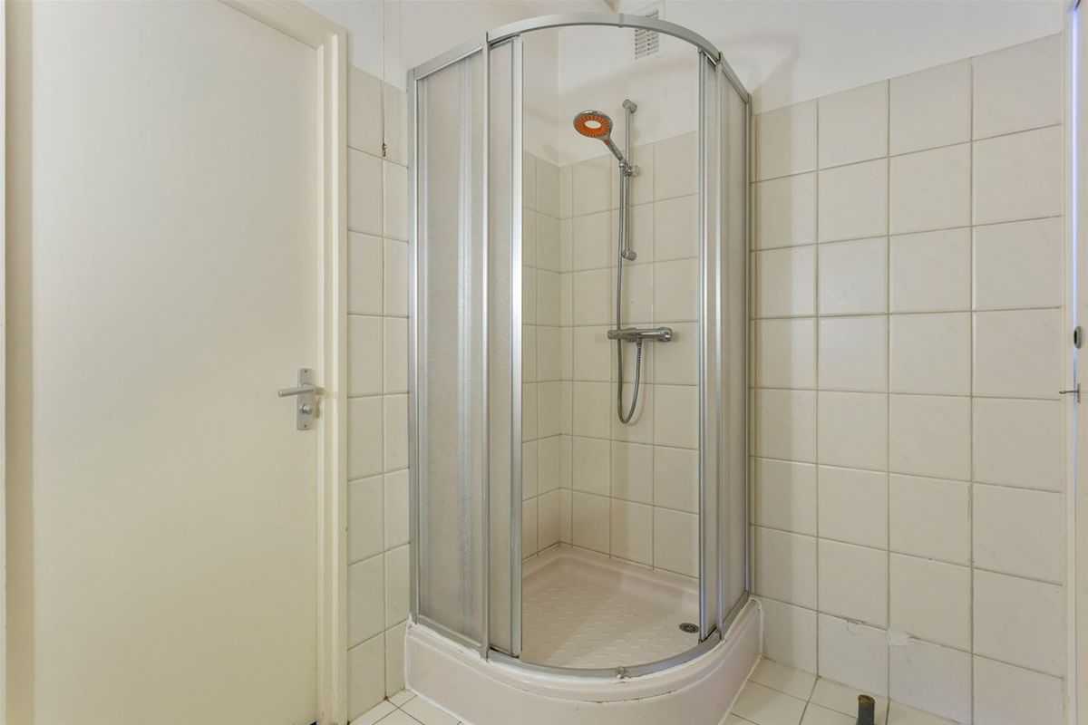 De badkamer heeft een doucheopstelling, wastafel, en opstelling wasmachine en droger. Verder apart gesitueerd een toilet met wastafel.