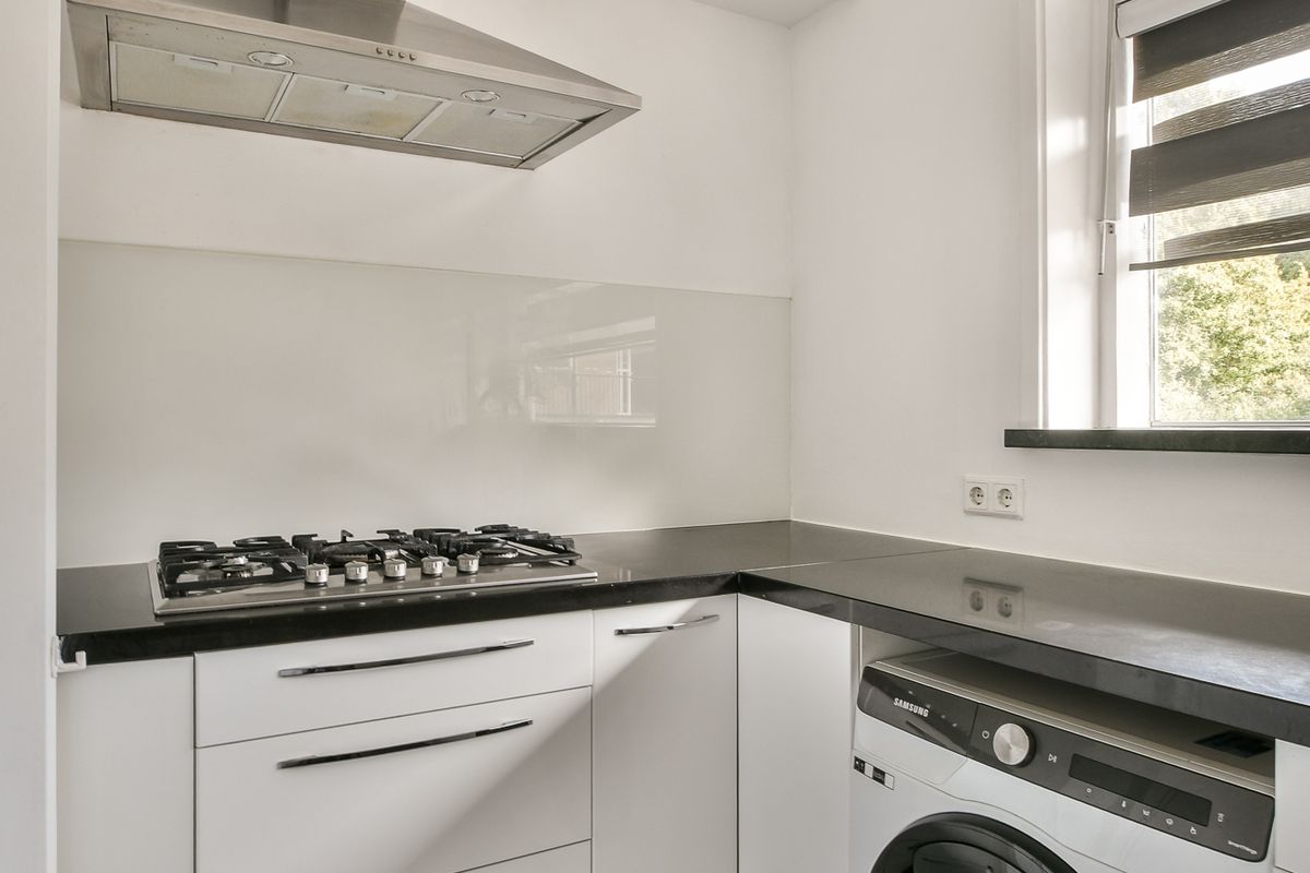 De moderne lichte keuken is voorzien van inbouwapparatuur zoals een oven, magnetron, rvs afzuigkap, 5-pits gaskookplaat, koel-vriescombinatie, en een wasmachine.