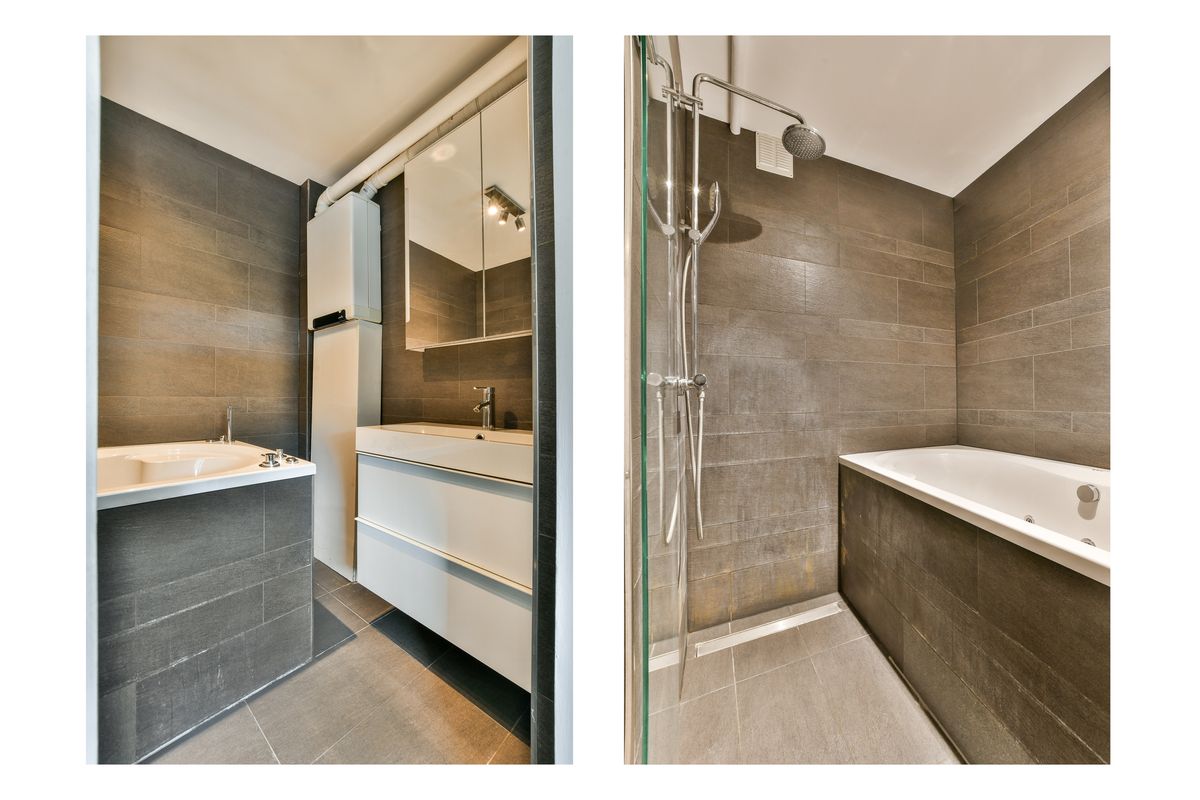 De luxe badkamer is modern uitgevoerd met een inloop regendouche, wastafelmeubel, spiegel met kast en ligbad. Geheel stijlvol betegeld tot aan het plafond. Daarnaast is er een apart modern zwevend toilet met fontijn.