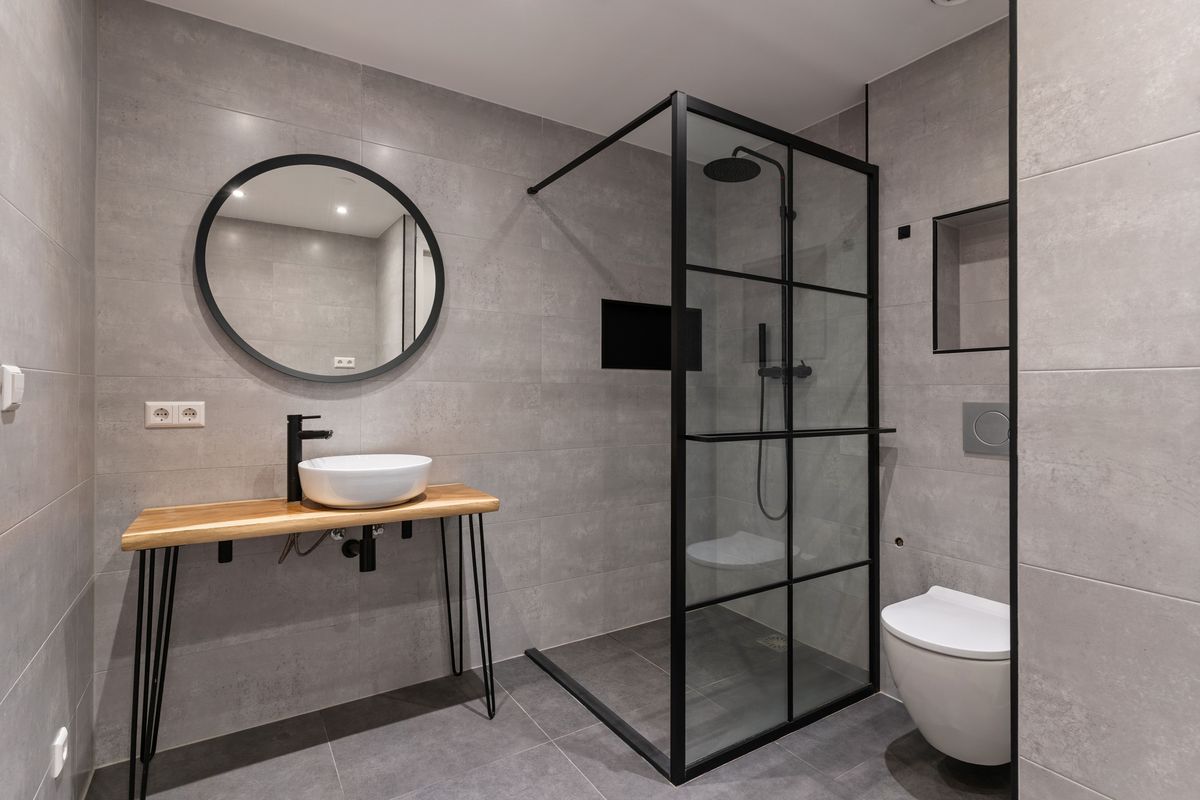 Luxe uitgevoerde badkamer met inloopdouche, hangend toilet, wastafelmeubel en aansluiting wasapparatuur.