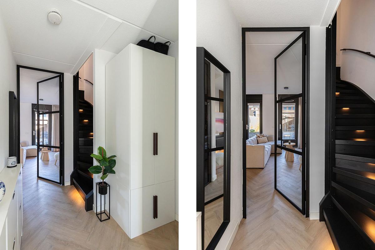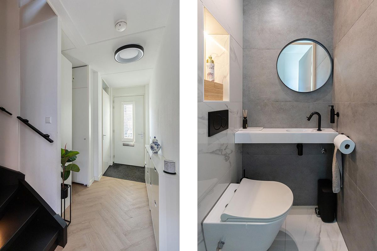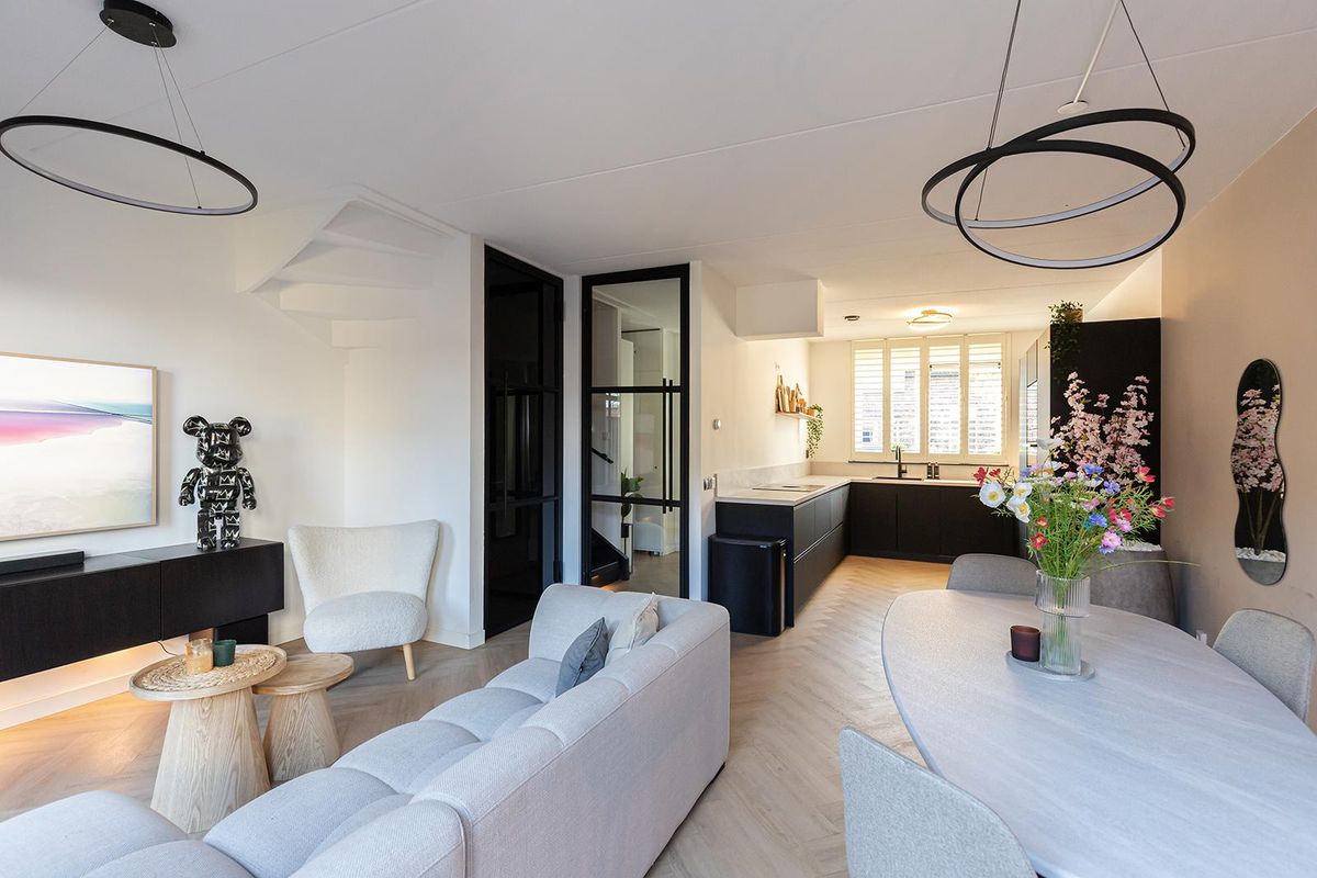 Op de begane grond word je verwelkomd in een stijlvolle hal met toegang tot het moderne toilet, de trapopgang en de woonkamer. Een glazen stalen tussenkozijn scheidt de hal van de woonkamer en zorgt voor een fraaie, eigentijdse doorkijk met veel licht. De prachtige pvc-vloer in visgraatmotief met vloerverwarming loopt drempelloos door naar de leefruimte en geeft het geheel een luxe, warme uitstraling. De woonkamer is heerlijk licht en ruim, met openslaande deuren naar de tuin voor dat fijne binnen-buitengevoel.