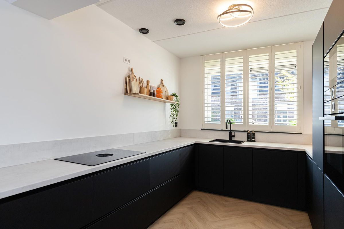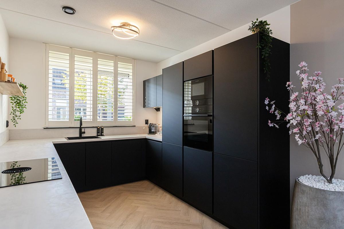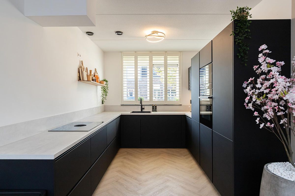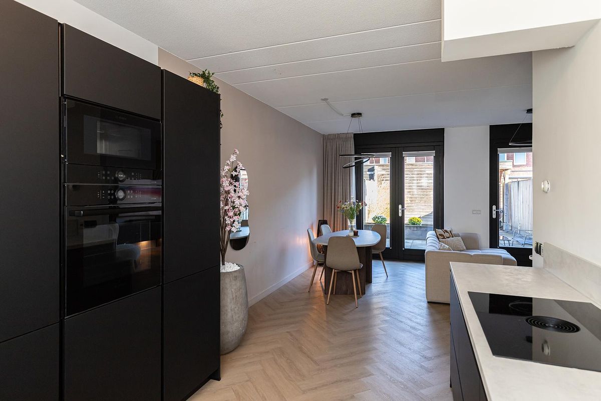 De keuken aan de voorzijde is in 2022 vernieuwd en vormt een echte blikvanger. De zwarte fronten in combinatie met het lichte werkblad zorgen voor een stijlvolle, moderne look. De keuken is voorzien van hoogwaardige inbouwapparatuur, waaronder een inductiekookplaat, combi-oven, vaatwasser, koelkast, vriezer, afzuigkap en Quooker.
