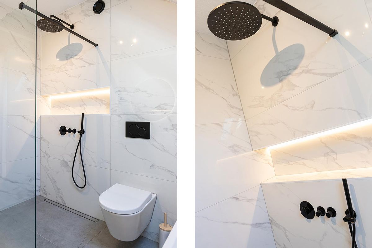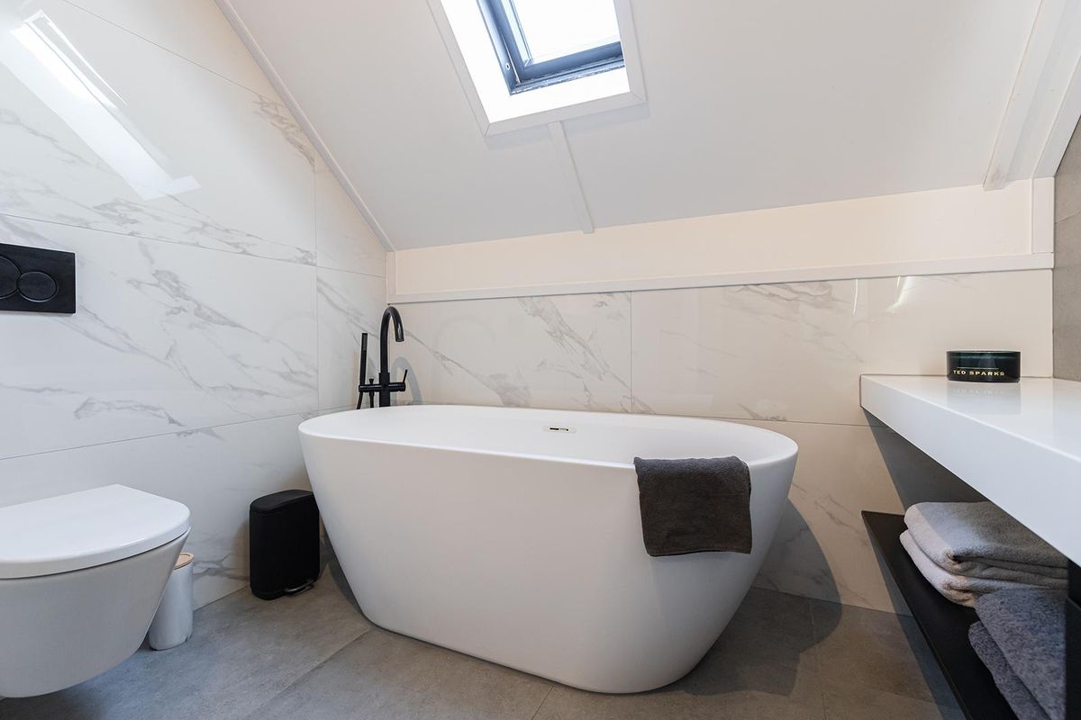 Op de eerste verdieping bevinden zich drie ruime slaapkamers, stuk voor stuk netjes afgewerkt en licht van karakter. De badkamer is eveneens vernieuwd en uitgevoerd in een moderne stijl met lichte tinten en stoere zwarte details. Hier vind je een vrijstaand ligbad, een aparte douche met hand- en regendouche, een dubbele wastafel met meubel, een spiegel met verlichting en een wandtoilet – alles tot in de puntjes verzorgd.