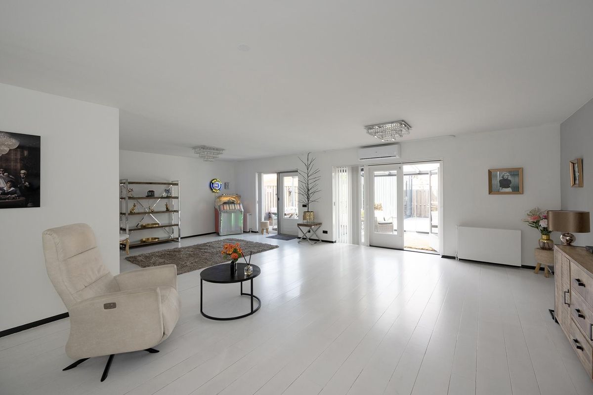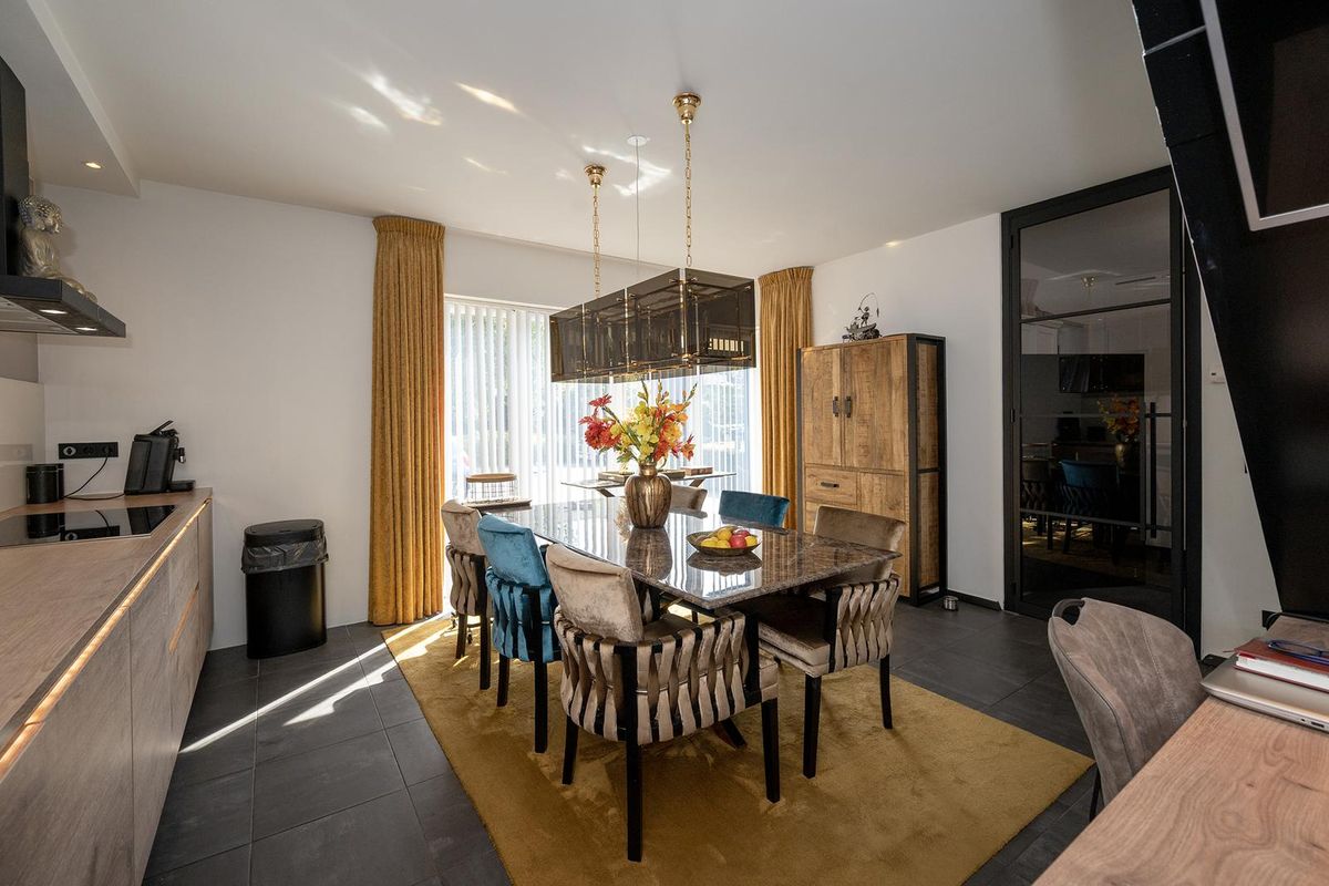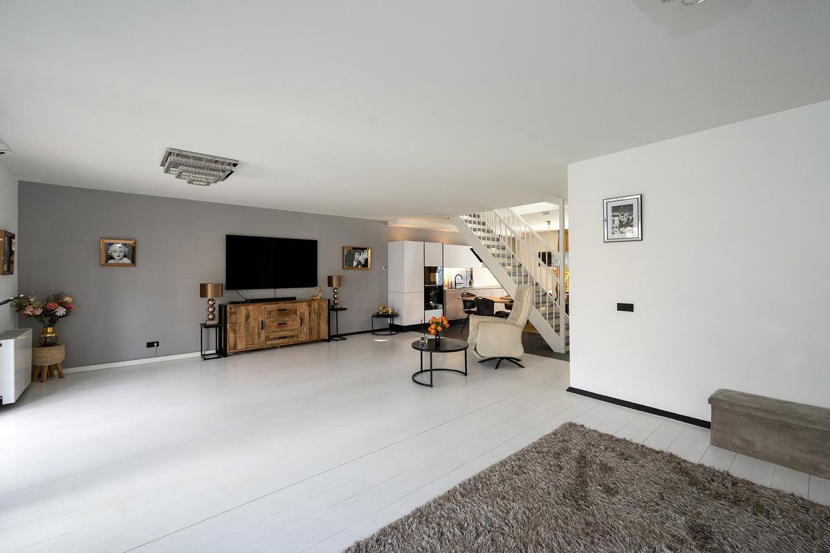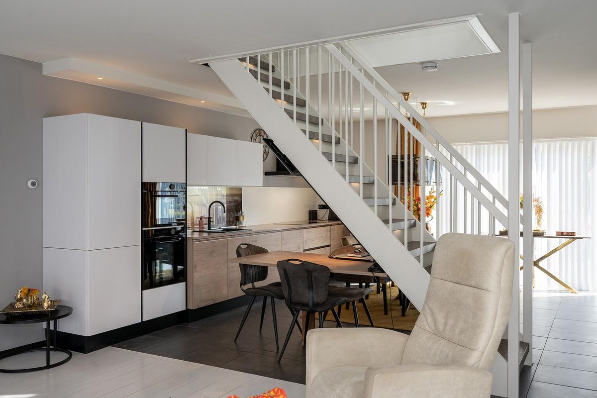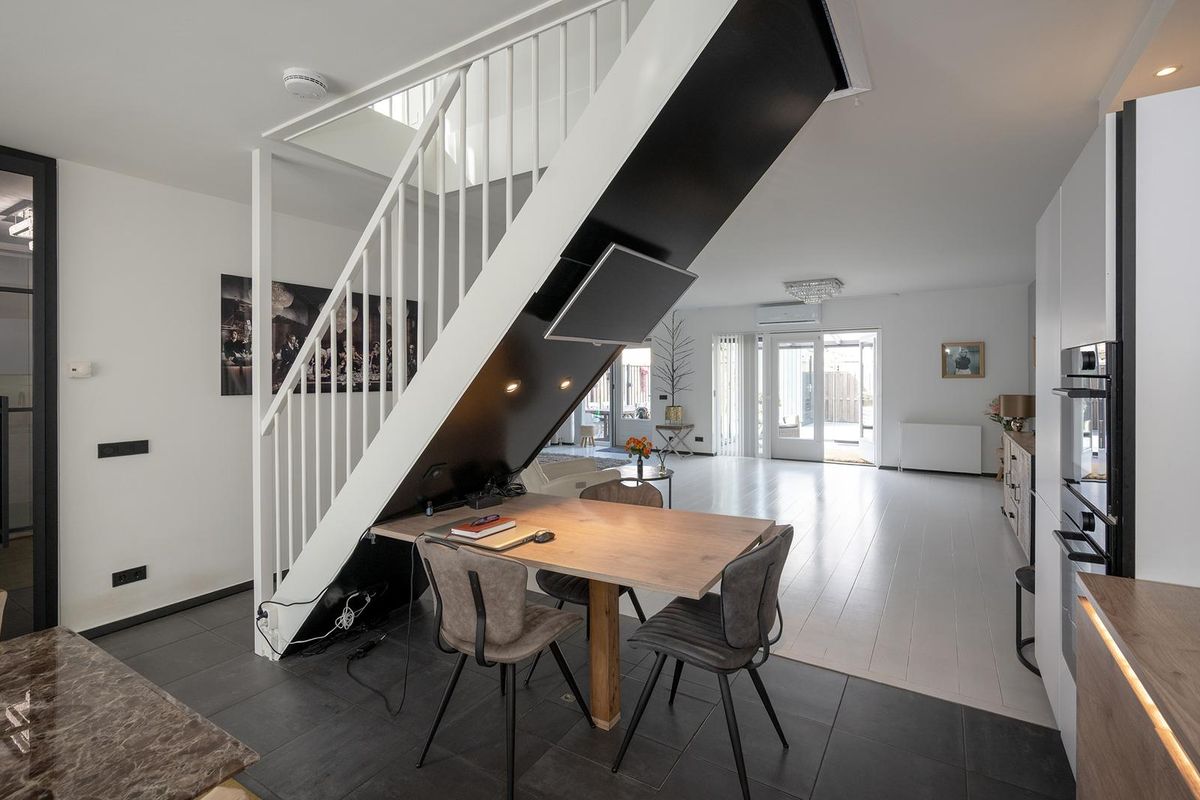Bij binnenkomst treft u een ruime hal, die is voorzien van een meterkast en een praktische voorraadkast. Daarnaast bevindt zich hier het toilet met een wandcloset en een fontein, die volledig is vernieuwd in 2023. Vanuit de hal is er toegang tot de keuken, welke in 2022 is geplaatst. De keuken is royaal van opzet en biedt voldoende ruimte voor het plaatsen van een grote eethoek. De inrichting bestaat uit een inbouwkeuken met ruim voldoende kastruimte en diverse inbouwapparatuur, waaronder een kookplaat met afzuigkap, een combi-oven/magnetron, Quooker, koelkast, vriezer en een vaatwasser. De vloer in zowel de hal als de keuken is afgewerkt met grote, donkere plavuizen, die zijn voorzien van vloerverwarming. Een open trap vormt de scheiding tussen de keuken en de ruime, tuingerichte woonkamer. Deze woonkamer beschikt over twee keer dubbele openslaande terrasdeuren, waardoor er veel lichtinval is en direct toegang wordt geboden tot de achtertuin. De houten vloer in de woonkamer is voorzien van een witte lak. Tevens kan deze ruimte met simpele aanpassingen omgebouwd worden naar een levensloopbestendig verblijf, door het realiseren van bijvoorbeeld een extra slaap- en badkamer op de begane grond.