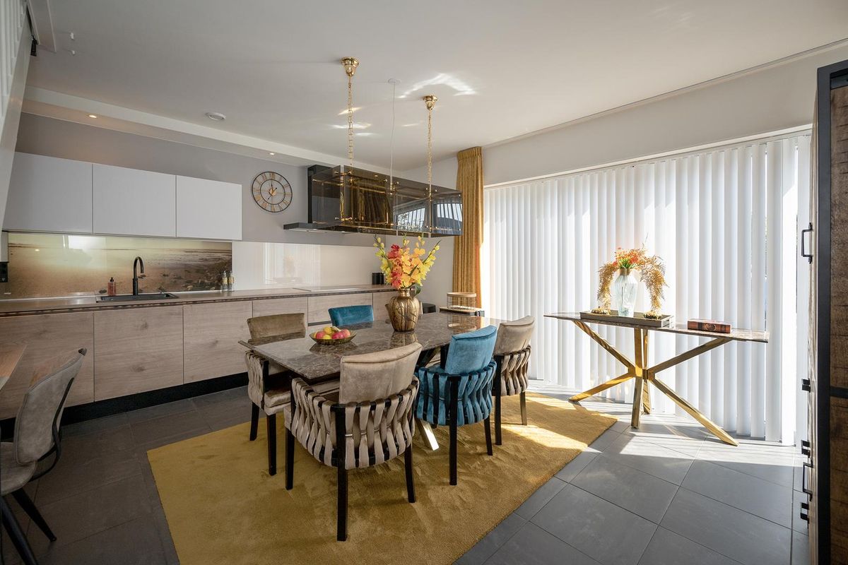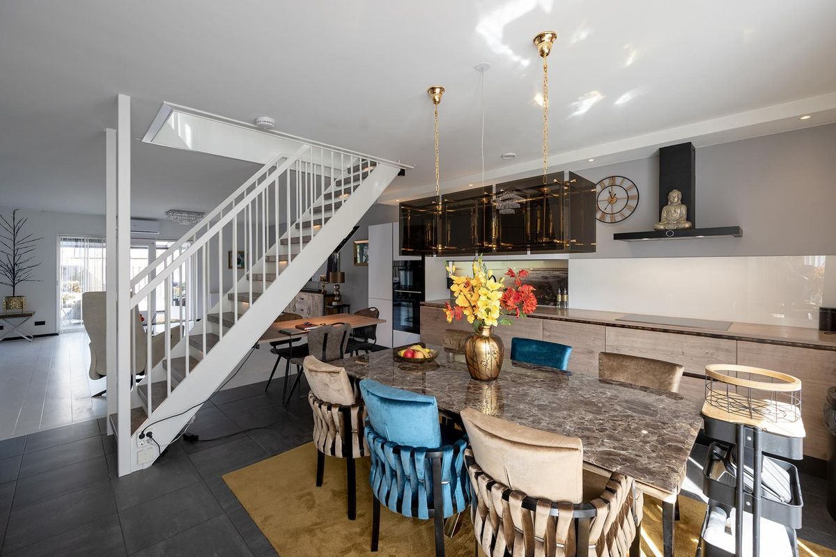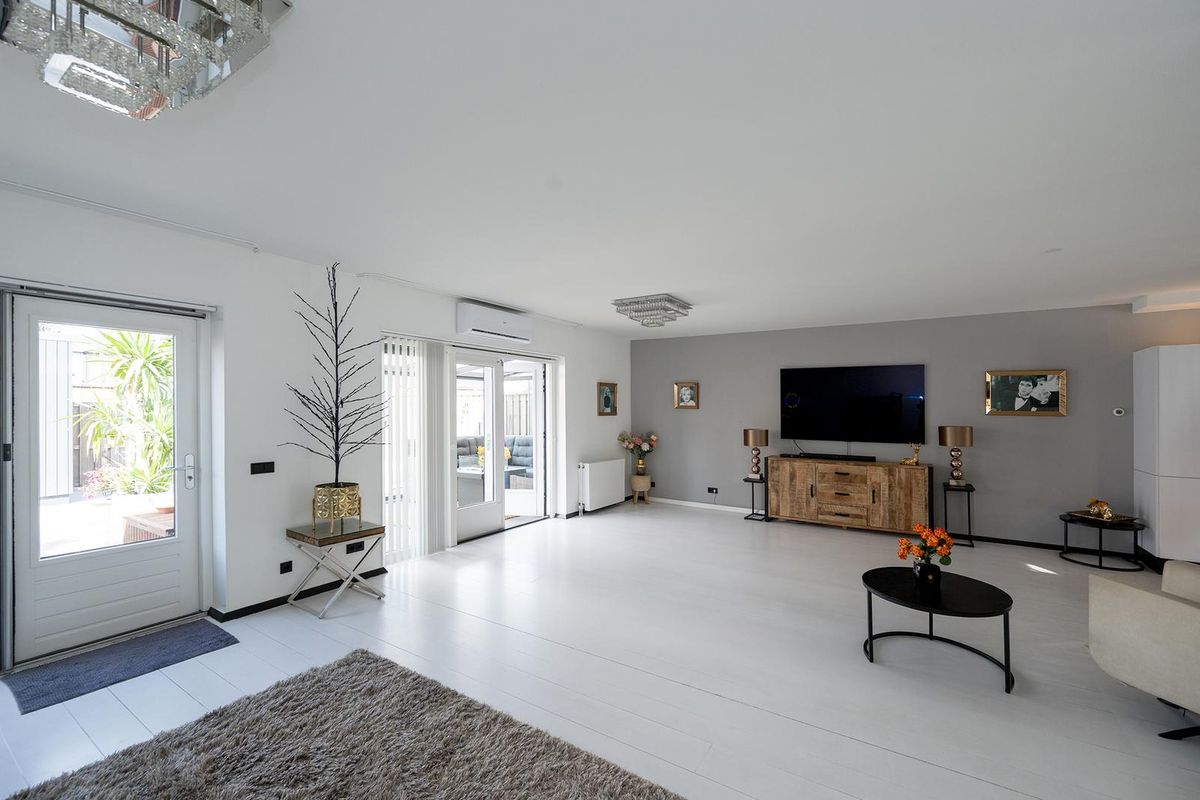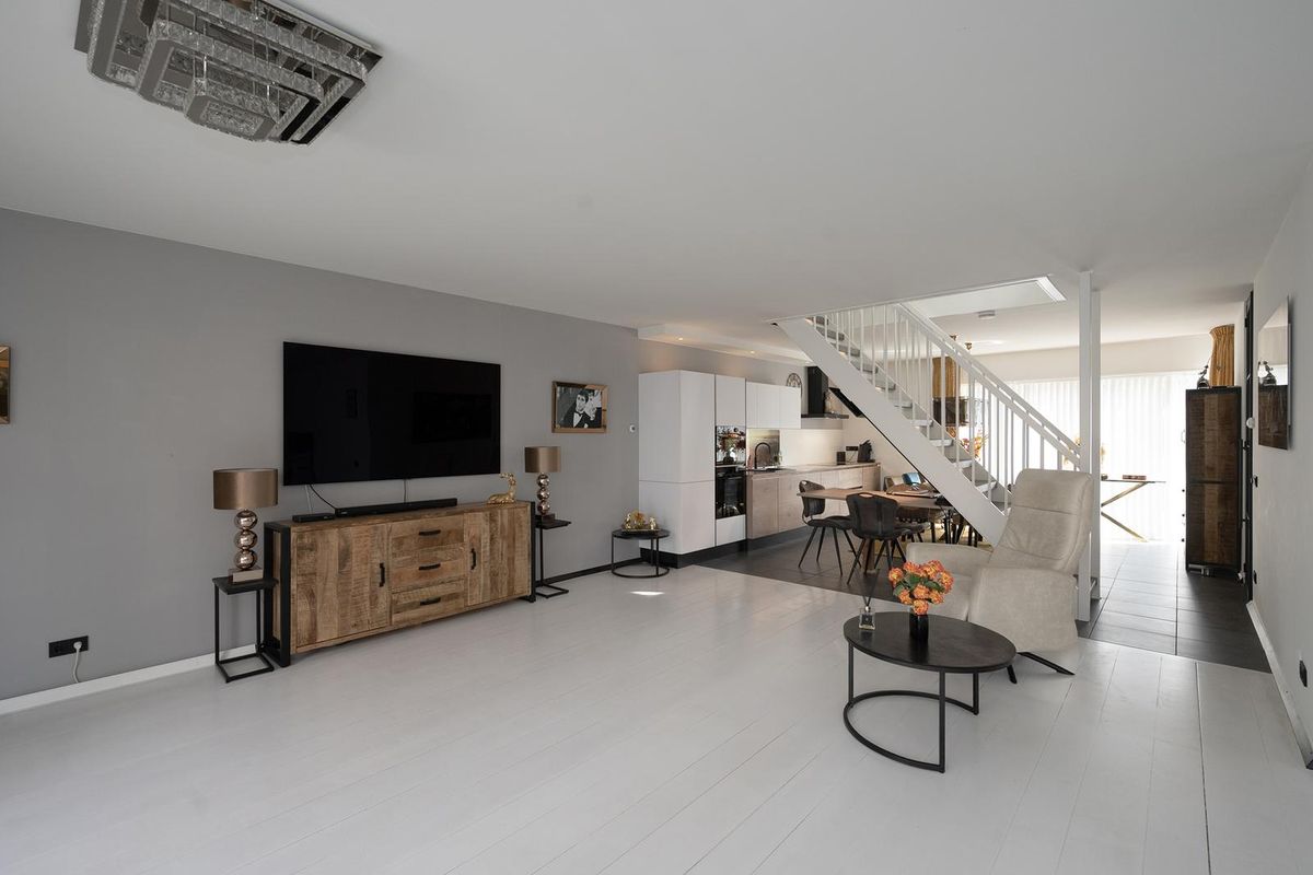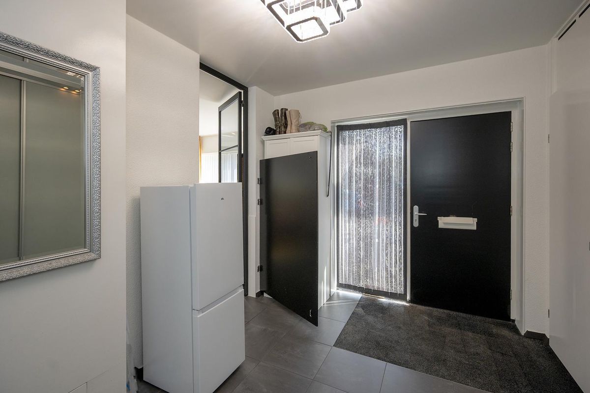 Bij binnenkomst treft u een ruime hal, die is voorzien van een meterkast en een praktische voorraadkast. Daarnaast bevindt zich hier het toilet met een wandcloset en een fontein, die volledig is vernieuwd in 2023. Vanuit de hal is er toegang tot de keuken, welke in 2022 is geplaatst. De keuken is royaal van opzet en biedt voldoende ruimte voor het plaatsen van een grote eethoek. De inrichting bestaat uit een inbouwkeuken met ruim voldoende kastruimte en diverse inbouwapparatuur, waaronder een kookplaat met afzuigkap, een combi-oven/magnetron, Quooker, koelkast, vriezer en een vaatwasser. De vloer in zowel de hal als de keuken is afgewerkt met grote, donkere plavuizen, die zijn voorzien van vloerverwarming. Een open trap vormt de scheiding tussen de keuken en de ruime, tuingerichte woonkamer. Deze woonkamer beschikt over twee keer dubbele openslaande terrasdeuren, waardoor er veel lichtinval is en direct toegang wordt geboden tot de achtertuin. De houten vloer in de woonkamer is voorzien van een witte lak. Tevens kan deze ruimte met simpele aanpassingen omgebouwd worden naar een levensloopbestendig verblijf, door het realiseren van bijvoorbeeld een extra slaap- en badkamer op de begane grond.