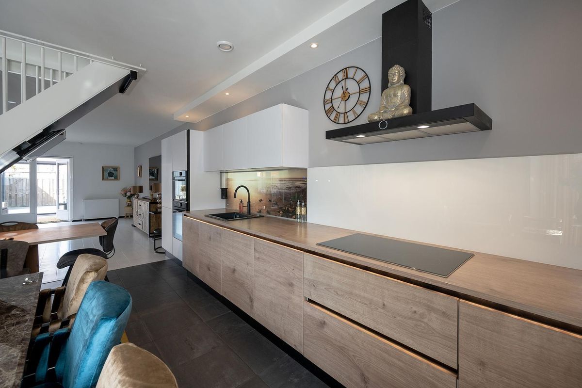Upon entering, you will find a spacious hall with a meter cupboard and a practical pantry. Next to it is the toilet with a wall-mounted toilet and a washbasin, which was completely renovated in 2023. The hall provides access to the kitchen, which was installed in 2022. The kitchen is spacious and offers enough room for a large dining area. The kitchen consists of a built-in kitchen with ample cupboard space and various built-in appliances, including a hob with extractor hood, a combi-oven/microwave, Quooker, refrigerator, freezer, and dishwasher. The floor in both the hall and the kitchen is finished with large, dark tiles, which are equipped with underfloor heating. An open staircase separates the kitchen from the spacious, garden-oriented living room. This living room has two double French doors, providing plenty of light and direct access to the backyard. The wooden floor in the living room is finished with white lacquer. With a few simple modifications, this space can also be converted into a lifetime home, for example by adding an extra bedroom and bathroom on the ground floor.