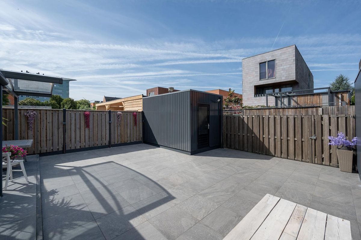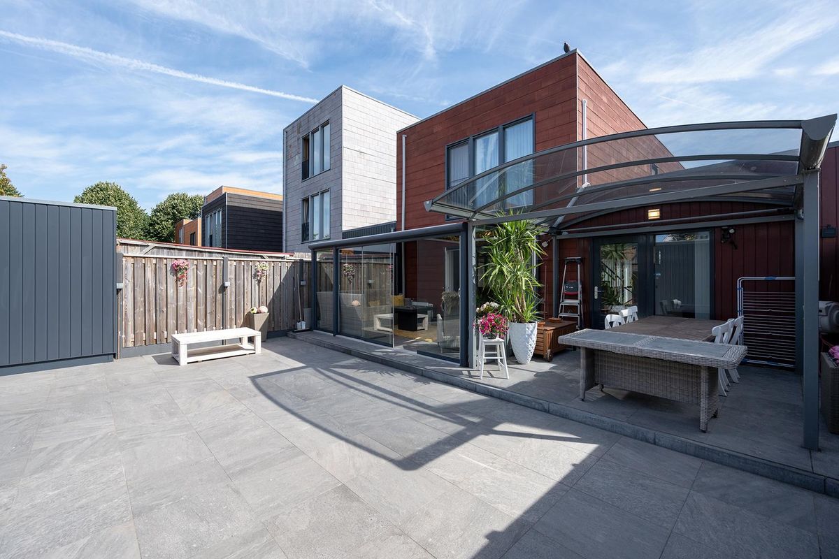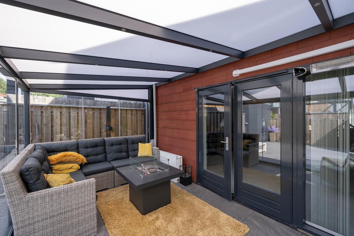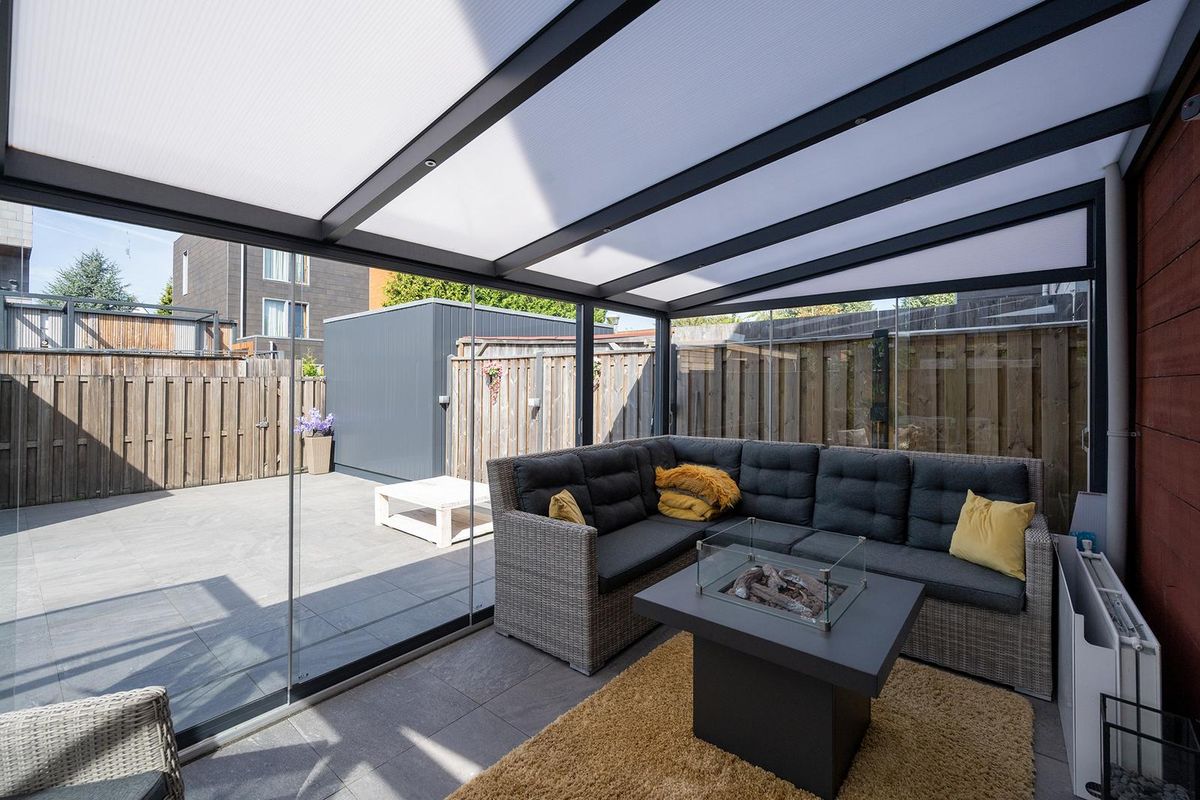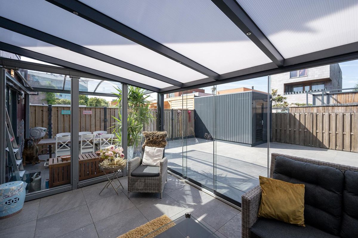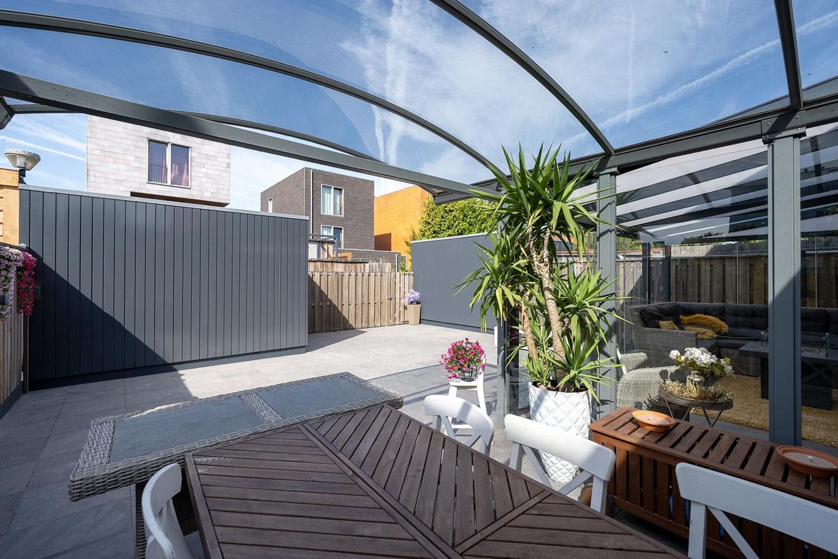 The backyard is fully paved with large gray tiles, making it low-maintenance and practical to use. Adjacent to the house is a spacious canopy with a glass roof, which offers protection from various weather conditions and makes it possible to stay outside comfortably even in less favorable weather. You can enjoy this area for a large part of the year! Adjacent to the patio is a lockable storage room, which offers extra storage space for bicycles, garden tools, or other necessities. The garden is spacious and completely enclosed by a wooden fence, ensuring privacy.