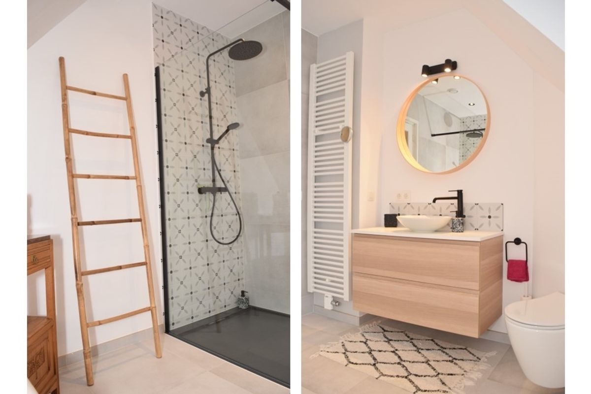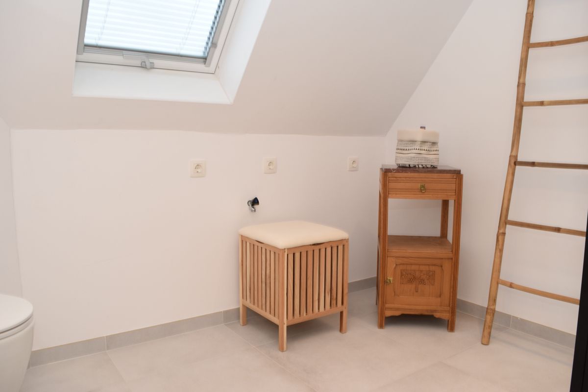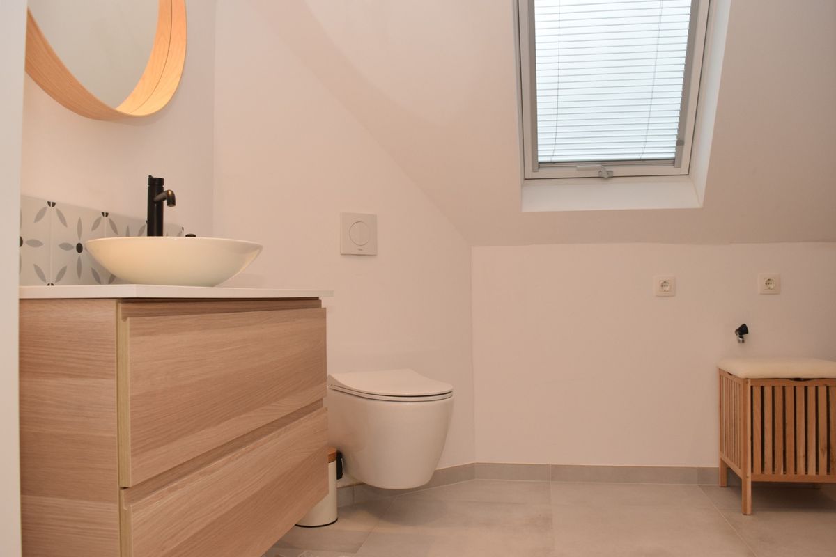 De eerste, ruime, badkamer beschikt over een inloopdouche, een wastafelmeubel en een tweede toilet. Hier vind je ook de aansluiting voor de wasmachine.