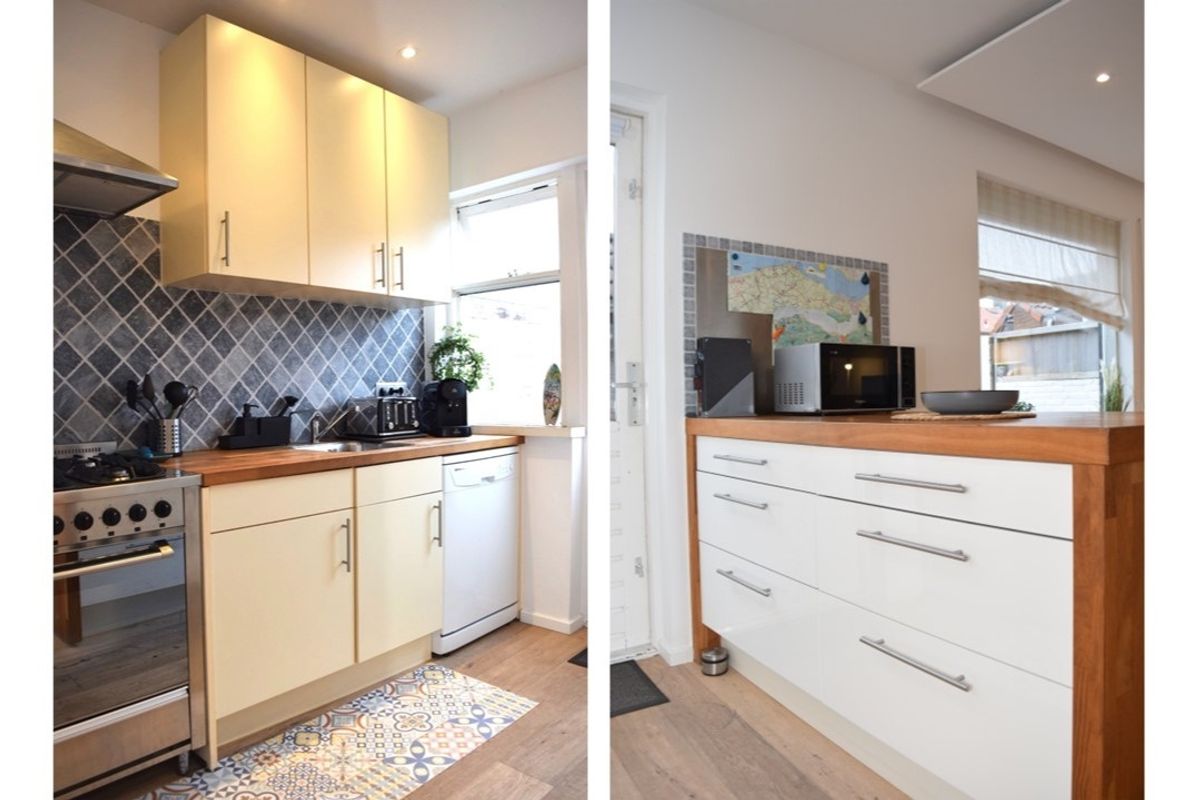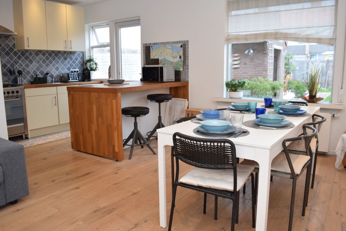 Via de hal met toilet, trapopgang en meterkast bereik je de sfeervolle woonkamer met een mooie houten vloer. De open keuken is voorzien van een praktisch kookeiland. De keuken heeft alle benodigde inbouwapparatuur. Aan het kookeiland zit een gezellig barretje – perfect om erbij te zitten met een kopje koffie of een glas wijn terwijl de ander staat te koken.
