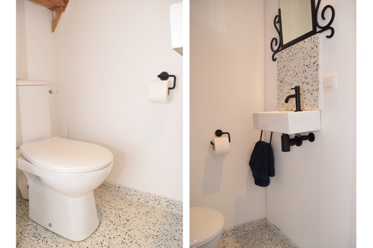 Het toilet is voorzien van een moderne terrazzo tegel en heeft een fonteintje.