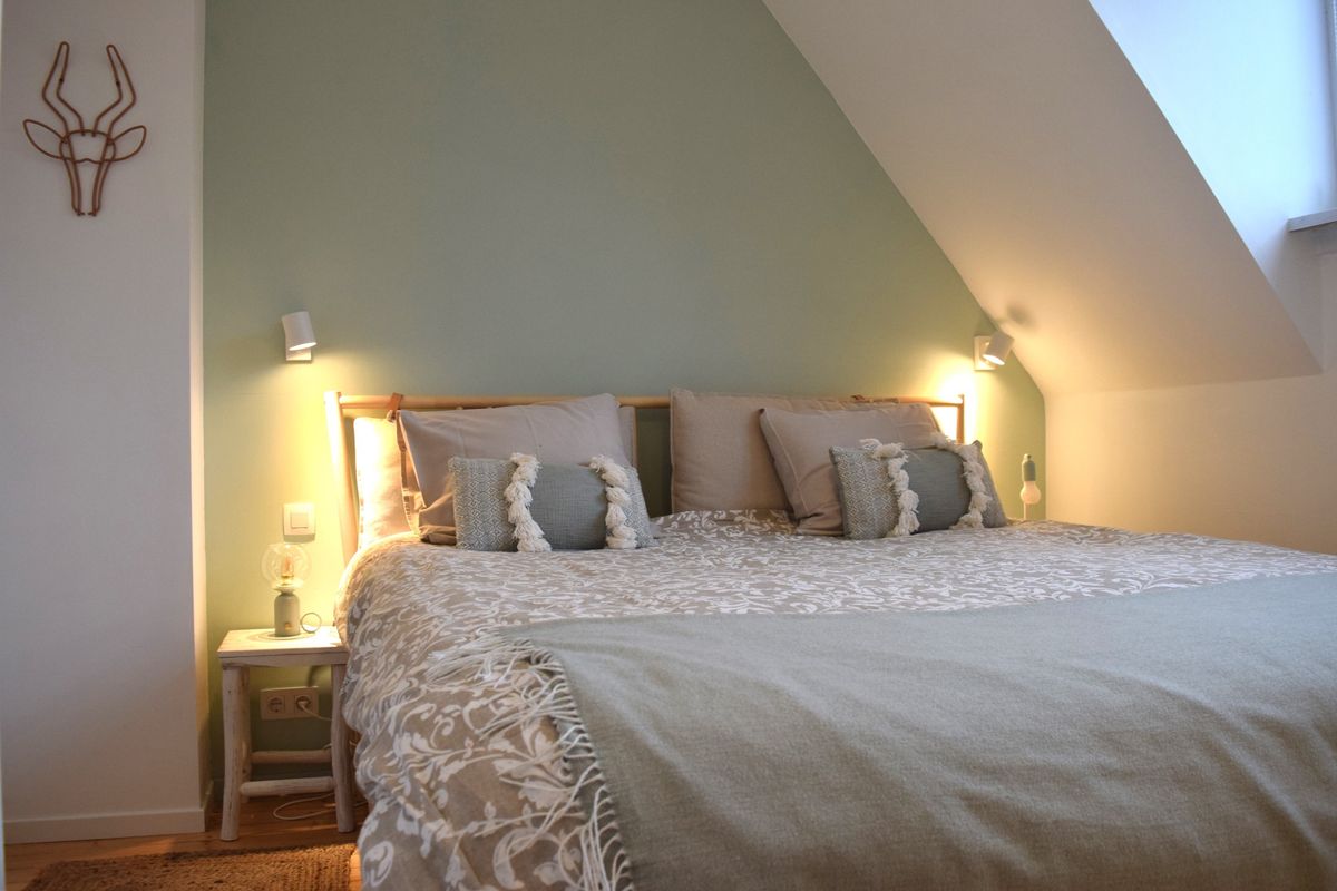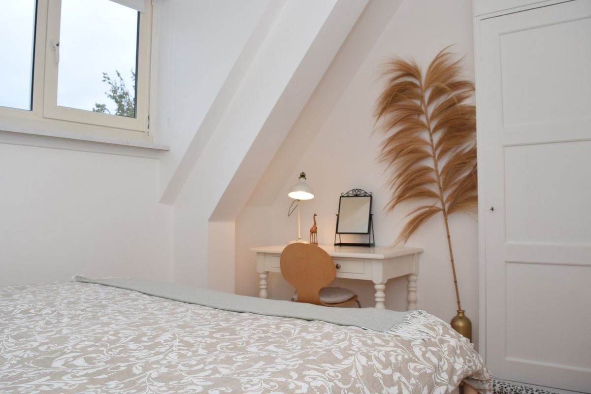 De hoofdslaapkamer aan de voorzijde van de woning is licht en sfeervol, voorzien van een kleine dakkapel en heeft praktische inbouwkasten.
