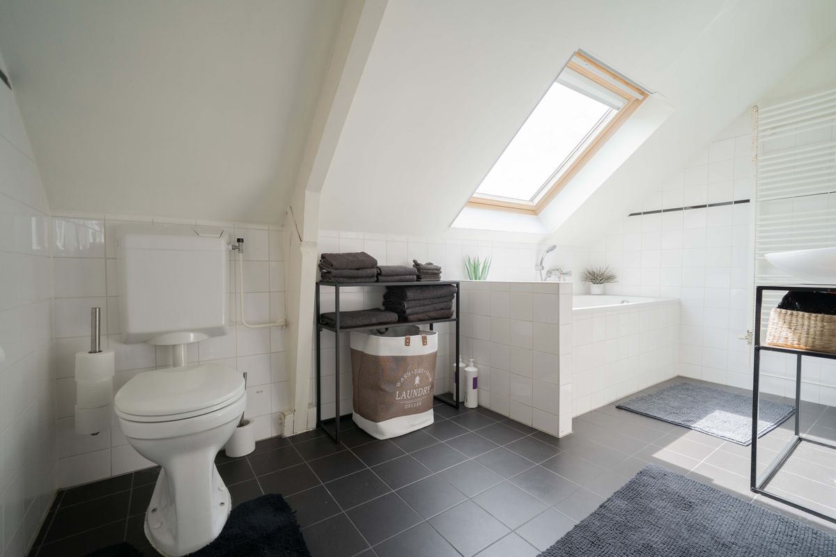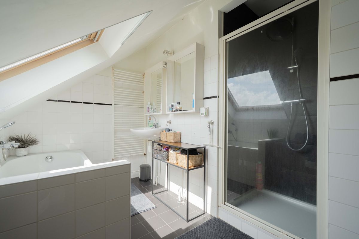 De badkamer is compleet uitgerust met een ligbad, aparte douche, een wastafel met spiegel en een designradiator. Dankzij het dakraam is er volop daglicht en natuurlijke ventilatie. Ook aan praktische zaken is gedacht: er is een aparte toiletruimte en een aparte ruimte voor de wasmachine en installaties.