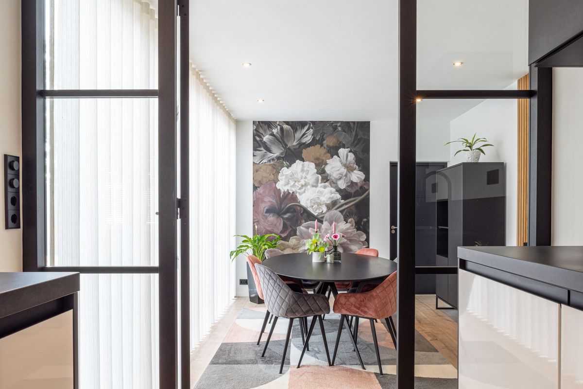 De doorzonwoonkamer is licht en ruim, voorzien van een mooie laminaatvloer (2021), een airco die zowel kan verwarmen als koelen, een elektrische haard die eveneens kan verwarmen en elektrische rolluiken voor extra comfort en privacy. Via de openslaande karakteristieke tuindeuren stapt u zo het terras in de achtertuin op. Via de keuken bereikt u de eetkamer, een gezellige ruimte met veel licht dankzij het grote raam met uitzicht op de tuin. Deze kamer beschikt over dezelfde fraaie laminaatvloer en inbouwspots en is ideaal als eet- of werkruimte. De ruimte is bovendien voorzien van stijlvolle houten, zwarte openslaande deuren (2022), die karakter en sfeer toevoegen en toegang bieden tot de keuken. Een tweede hal met een extra voordeur maakt het mogelijk deze ruimte desgewenst te gebruiken als kantoor of praktijk aan huis.