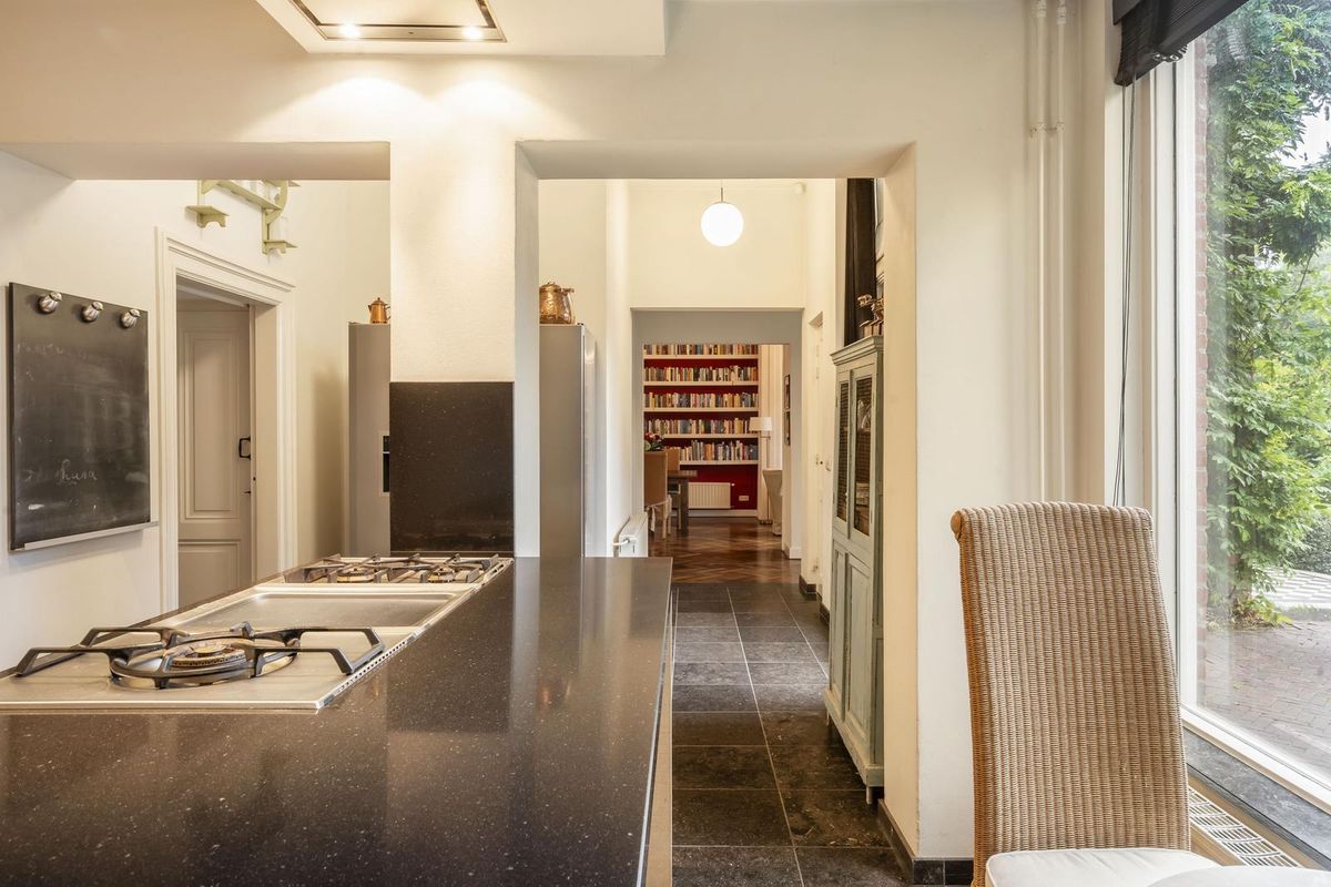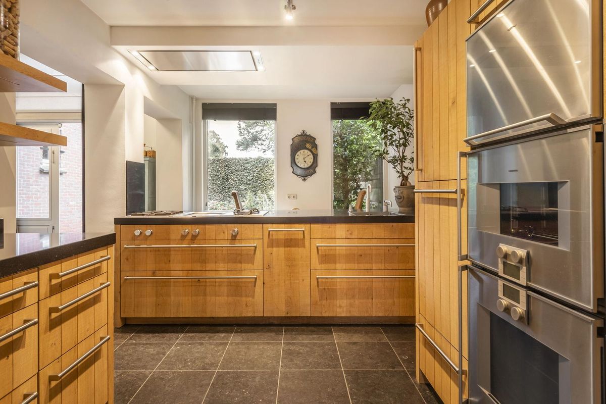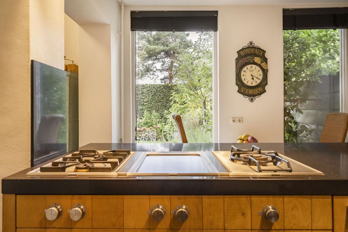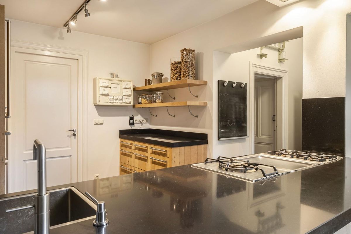 De woonkeuken met kookeiland en zitgedeelte is afgewerkt met een Belgisch hardstenen tegelvloer en stucwerk als wand- en plafondafwerking. De luxe woonkeuken is voorzien van een granieten aanrechtblad en eikenhouten frontjes, Gaggenau bakplaat, 2-pits gasfornuis en wokbrander, Gaggenau oven, stoomoven en magnetron, afzuigkap, vaatwasser op hoogte, Amerikaanse koelkast, Quooker en een gootsteen. Vanuit de keuken zijn de kelder (op stahoogte) en de werkkamer bereikbaar. Middels de openslaande tuindeuren bereikt u het terras waar u heerlijk kunt genieten van een wijntje in de privacy biedende achtertuin.